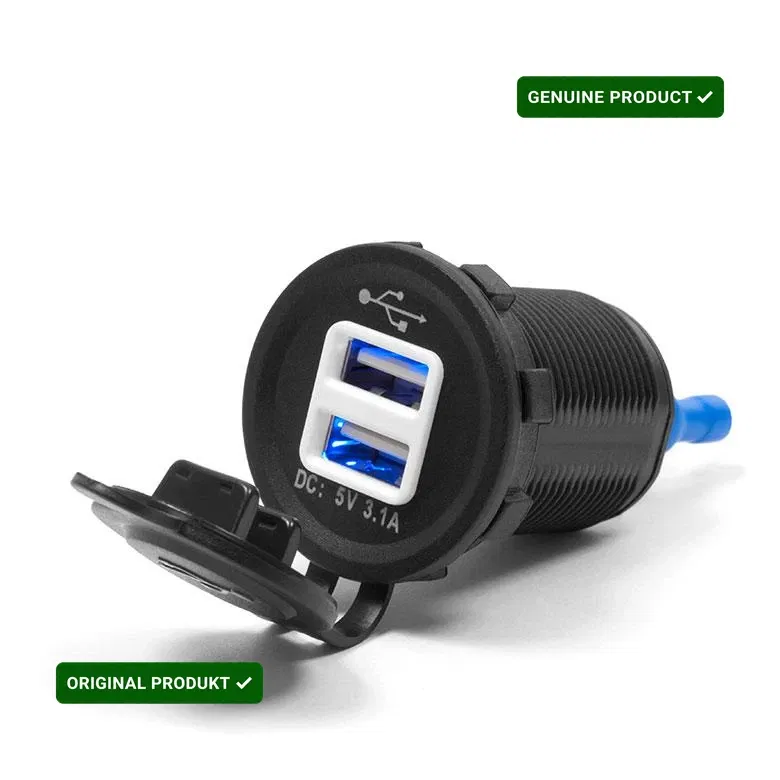 BIKETEC BTMUS11 to motocyklowe podwójne gniazdo USB z podświetleniem, przeznaczone do ładowania urządzeń elektronicznych. Umożliwia montaż na płaskich powierzchniach, takich jak owiewka czy kufer, a także na kierownicy po zastosowaniu odpowiedniego adaptera (np. BTMUS28). Zapewnia wygodne źródło zasilania 12V dla urządzeń mobilnych.