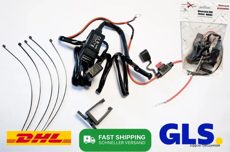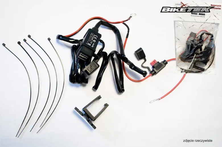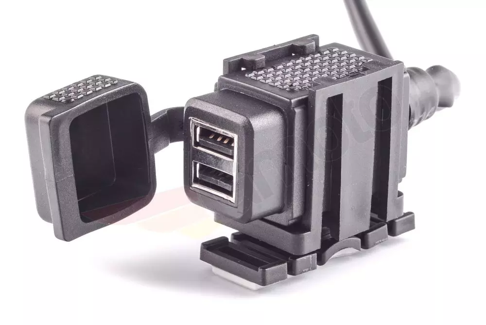 Gniazdo USB BIKETEC BTMUS05 to podwójne złącze USB przeznaczone do ładowania urządzeń elektronicznych na motocyklu. Wyposażone jest w bezpiecznik, co zapewnia ochronę podłączonych urządzeń. Może być montowane na płaskich powierzchniach, takich jak owiewki czy kufry, lub na kierownicy przy użyciu dedykowanego adaptera.