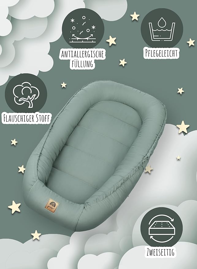 Wysokiej jakości materiały i antyalergiczne wypełnienie zapewniają Twojemu dziecku wolne od alergii i zdrowe środowisko dobrego samopoczucia. Miękkie wypełnienie z higienicznych kulek silikonowych nie wywołuje alergii i zapobiega podrażnieniom skóry. Poszewka posiada certyfikat Öko-Tex Standard 100, gniazdo dla niemowląt można prać ręcznie w temperaturze 40°.