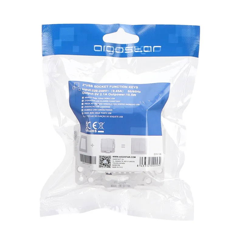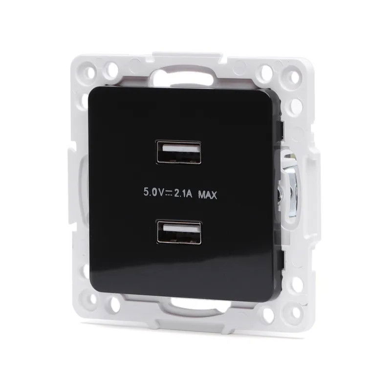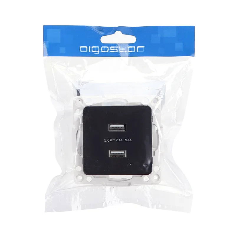 Części zewnętrzne gniazdka USB wykonane z tworzywa sztucznego w kolorze czarnym. Sposób łączenia kabla poprzez zaciski śrubowe. Ramka pokrywy nie jest dołączona do zestawu. Gniazdo przeznaczone do zasilania różnorodnych urządzeń bezpiecznym napięciem 5V i łącznym poborze prądu do 2.1A, maksymalna moc oddana to 10,5W. Sprawdzi się w pokoju dziecięcym jako bezpieczne źródło niskiego napięcia dla lampki nocnej, ładowarka do zabawek i innych urządzeń. Można ładować telefon ale nie obsługuje szybkiego ładowania. Gniazdko jest wymiarowo kompatybilne z gniazdami sieciowymi i można je stosować zamiennie.