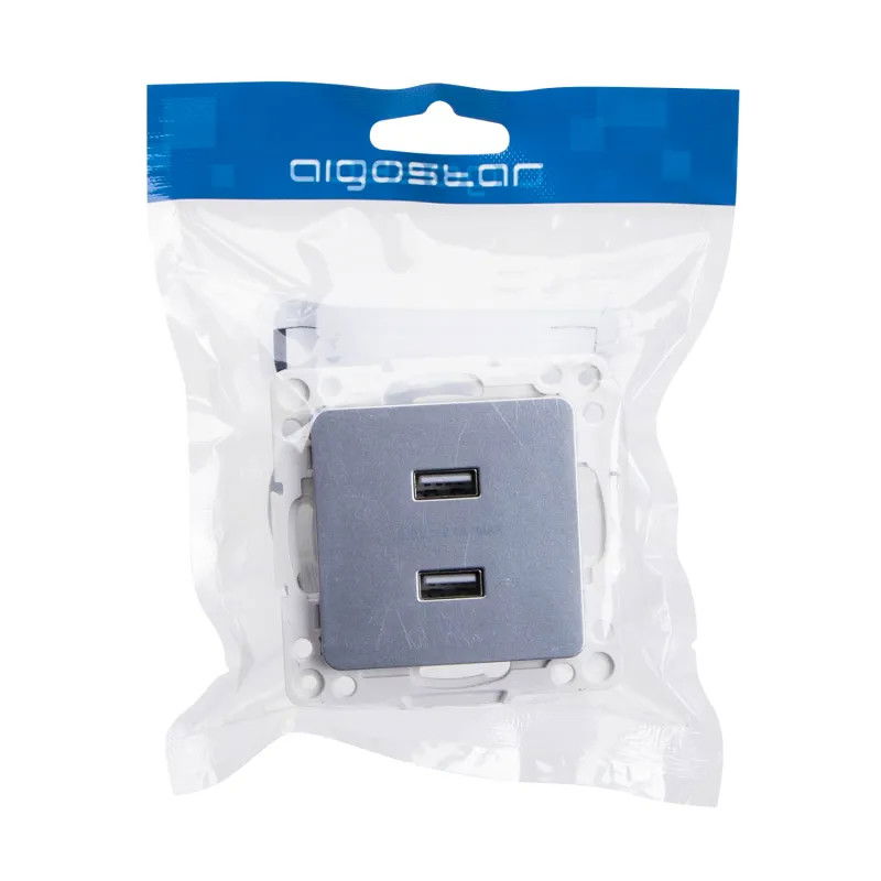 Części zewnętrzne gniazdka USB wykonane z tworzywa sztucznego w kolorze srebrnym. Sposób łączenia kabla poprzez zaciski śrubowe. Ramka pokrywy nie jest dołączona do zestawu. Gniazdo przeznaczone do zasilania różnorodnych urządzeń bezpiecznym napięciem 5V i łącznym poborze prądu do 2.1A, maksymalna moc oddana to 10,5W. Sprawdzi się w pokoju dziecięcym jako bezpieczne źródło niskiego napięcia dla lampki nocnej, ładowarka do zabawek i innych urządzeń. Można ładować telefon ale nie obsługuje szybkiego ładowania. Gniazdko jest wymiarowo kompatybilne z gniazdami sieciowymi i można je stosować zamiennie.