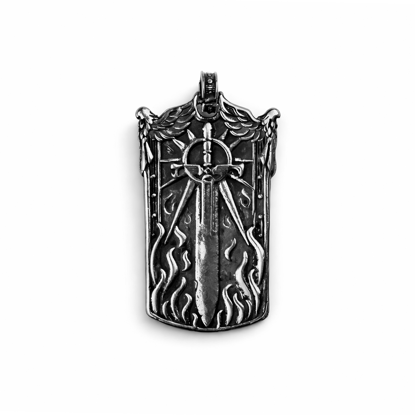 Odwrotna strona, równie porywająca, przedstawia centralny miecz przebijający parę skrzydeł, otoczony wirującymi, płomiennymi wstęgami – potężne odniesienie wizualne do ostatecznego poświęcenia Imperatora i jego walki przeciwko siłom Chaosu. Polerowany metalowy pierścień u góry zapewnia bezpieczne przymocowanie do breloczka lub łańcuszka.