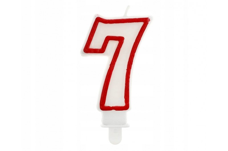 Ładna świeczka w kolorze białym z czerwonym obramowaniem - cyfra 7. Dodatkowo posiada podstawkę, która umożliwia przymocowanie do tortu zapewniając jej stabilność. Piękna dekoracja urodzinowego tortu dla młodszych i starszych solenizantów i jubilatów. Sprawdzi się także idealnie na wszelkiego rodzaju rocznicach, bankietach firmowych i wszędzie tam, gdzie z cyfr można ułożyć liczbę lub rok.