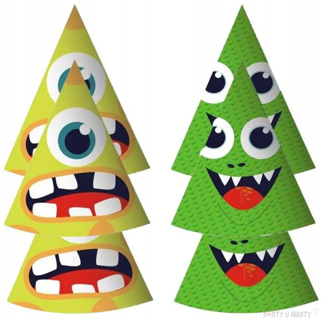 Czapeczki papierowe z motywem "Wesołe Potwory". Czapeczki występuje w zestawie po 3 w kolorze żółtym i zielonym. Świetnie sprawdzą się na przyjęciu urodzinowym dla Twojej pociechy.