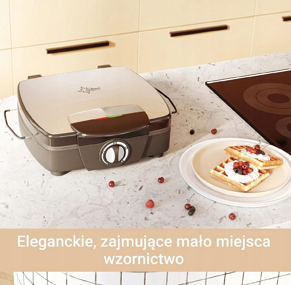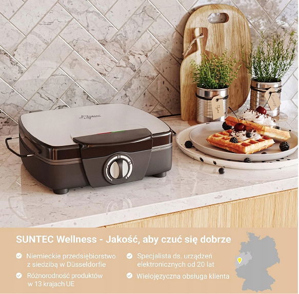 Dzięki wysokiej mocy 1200 W gofry pieką się w gofrownicy SUNTEC zaledwie ok. 5-6 minut.
