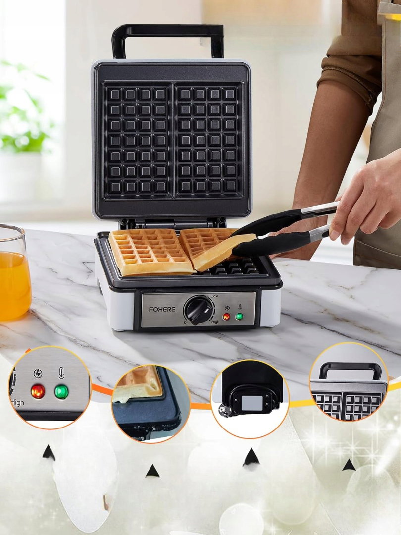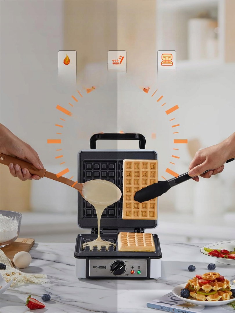 FOHERE można łatwo wyczyścić wilgotną ściereczką. Trwała powłoka nieprzywierająca zapewnia łatwe wyjmowanie gofrów po upieczeniu, bez przyklejania się i pękania. Okrągłe rowki wychwytują nadmiar ciasta i zapobiegają jego wyciekaniu. Osiągnięcie pożądanej konsystencji lub tekstury wymaga kilku prób, aby uniknąć rozlania za pierwszym razem.