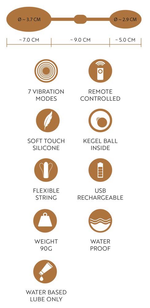 Wibrujące urządzenie treningowe i lovetoy w jednym! Kulki miłości Vibrating Pussy & Ass Balls marki GoGasm do anusa i waginy, połączone elastycznym silikonowym paskiem. Większa kulka wibruje, podczas gdy mała kulka zawiera zmysłowo kołyszący się ciężarek. Większy pocisk wkłada się po prostu do pochwy - a mniejszy do odbytu, tak że żaden pasek nie zwisa. 7 trybów wibracji może być kontrolowanych za pomocą pilota, który posiada również blokadę przycisków. Dyskretnie przenośny do codziennego użytku. Wodoodporny. W zestawie kabel USB do ładowania i bateria do pilota (1 x 23A).