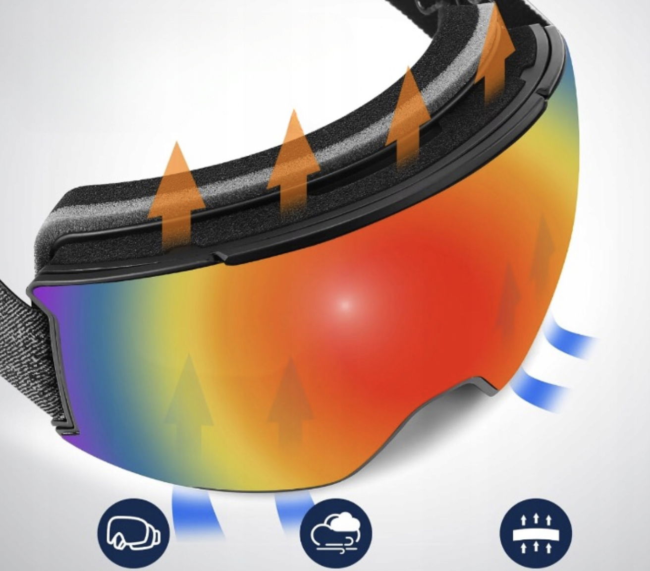 Dwuwarstwowa technologia soczewek z wewnętrzną powłoką przeciwmgielną, z dwukierunkowym systemem wentylacji, zapewnia wrażenia z jazdy na nartach bez mgły.