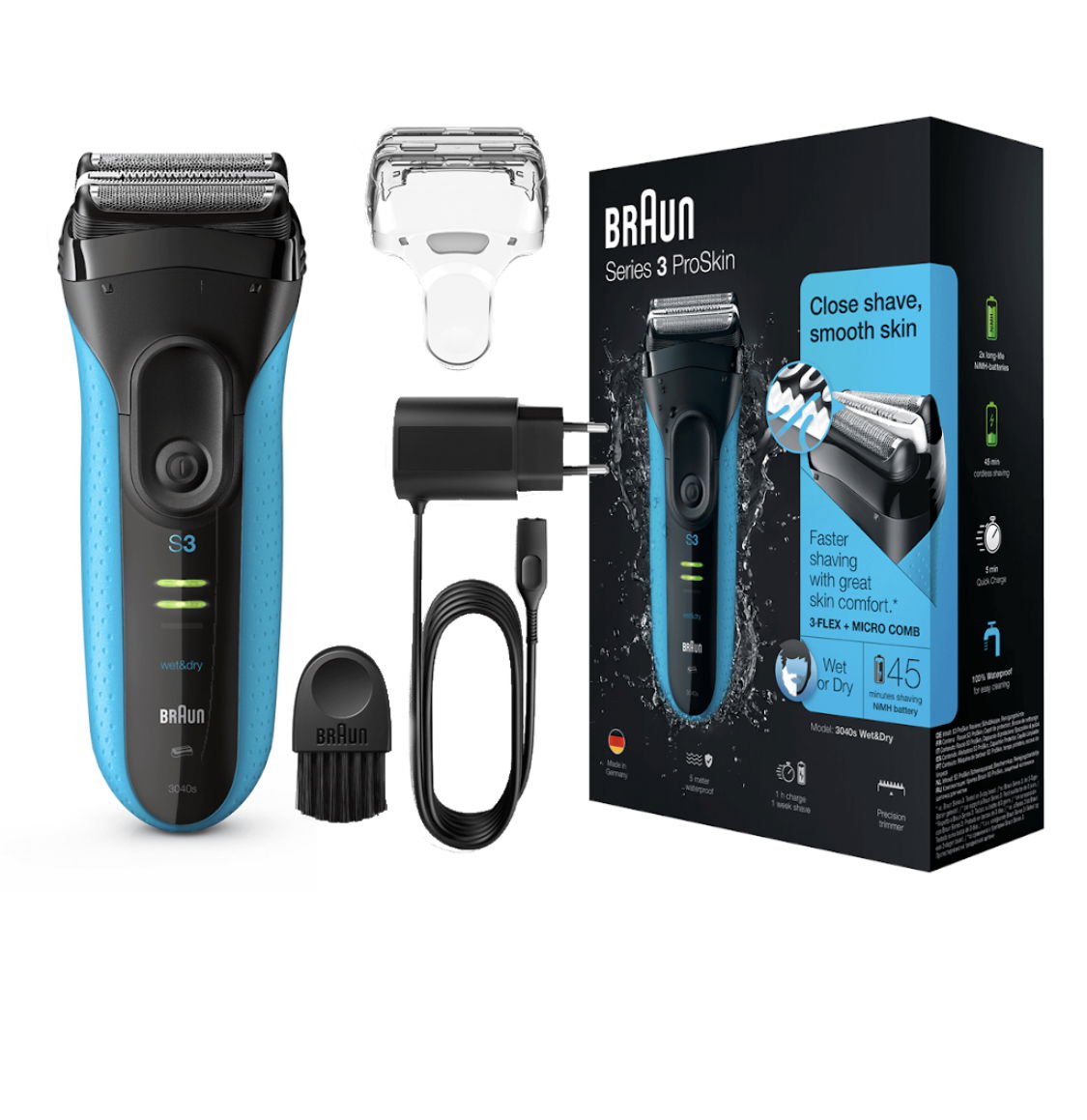 Podwójne folie oraz zintegrowany środkowy trymer podczas golenia stopniowo zbliżają się coraz bardziej do skóry. Łącznie elementy te skutecznie tną zarówno długie, jak i krótkie włosy przy każdym pociągnięciu, zapewniając sprawdzony efekt nawet w przypadku trudnego, 3-dniowego zarostu.