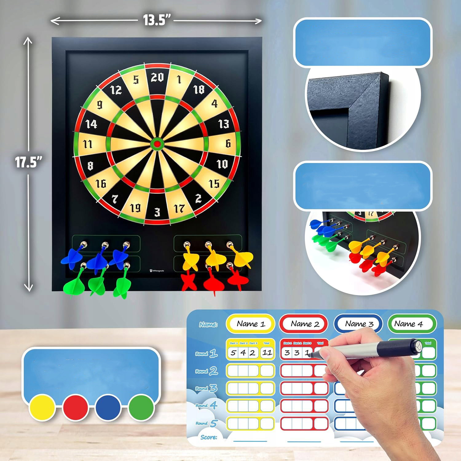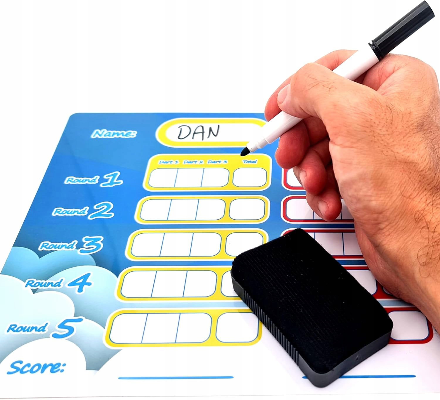 Suchościeralna tablica umożliwia łatwe śledzenie punktów nawet przez 5 rund. Każdy gracz może wybrać swój kolor i zapisywać wyniki z 3 rzutów w każdej rundzie. To nie tylko zabawa, ale także świetny sposób na ćwiczenie liczenia i koncentracji.