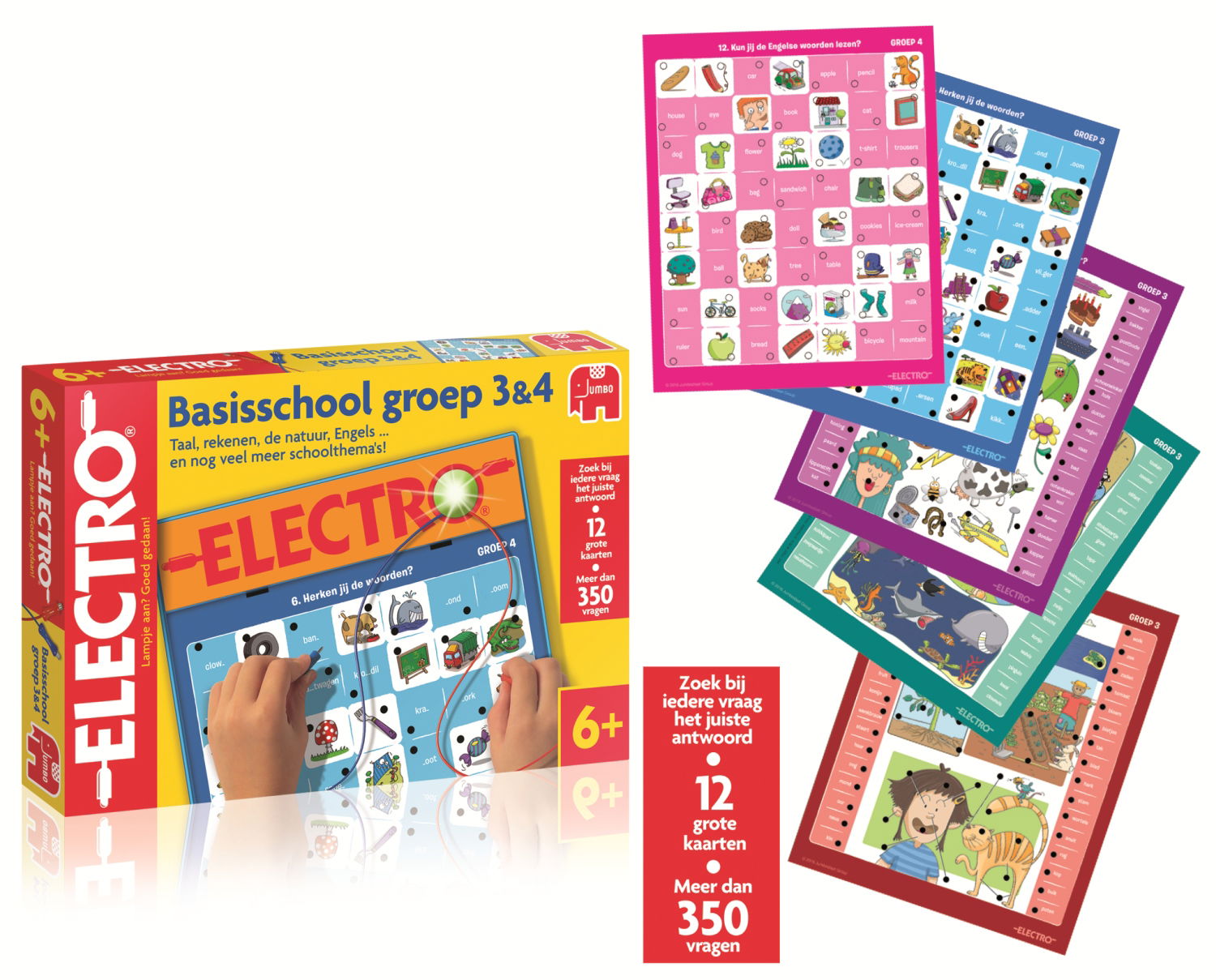 Jumbo Electro 3‑4 to interaktywna gra elektroniczna wspierająca naukę w klasach 3 i 4 szkoły podstawowej. Dzięki modułowi z czerwonym i niebieskim przewodem dziecko łączy pytania z poprawnymi odpowiedziami, a lampka sygnalizuje poprawność. Zestaw zawiera 12 dużych kart z ponad 350 zadaniami z zakresu czytania, matematyki, przyrody i języka angielskiego – idealny sposób na zabawę i rozwijanie umiejętności szkolnych.