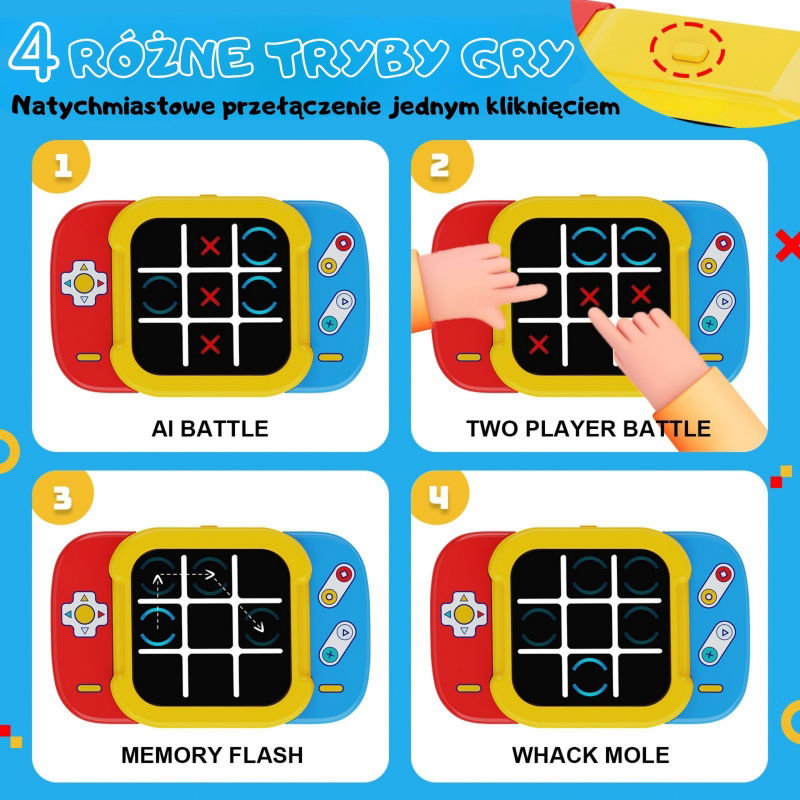 Rozpocznij niesamowitą przygodę z nowoczesną elektroniczną grą marki Woopie! Ta kolorowa konstrukcja z interaktywnym wyświetlaczem LCD zapewni Ci niezapomniane chwile rozrywki. Gra oferuje cztery różnorodne tryby rozgrywki, w tym bitwę z AI, pojedynki 1v1, memory oraz uderz kreta. Dodatkowo, wbudowana klasyczna gra w kółko i krzyżyk sprawi, że nigdy nie będziesz się nudzić!