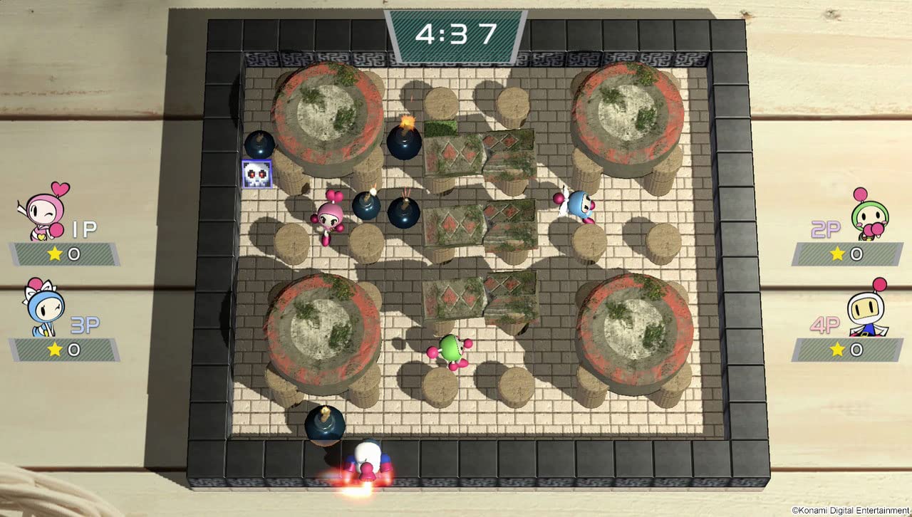 - Klasyczne areny Bombermana – labirynt z klocków, przeszkód i wąskich przejść, gdzie każda decyzja ma znaczenie.