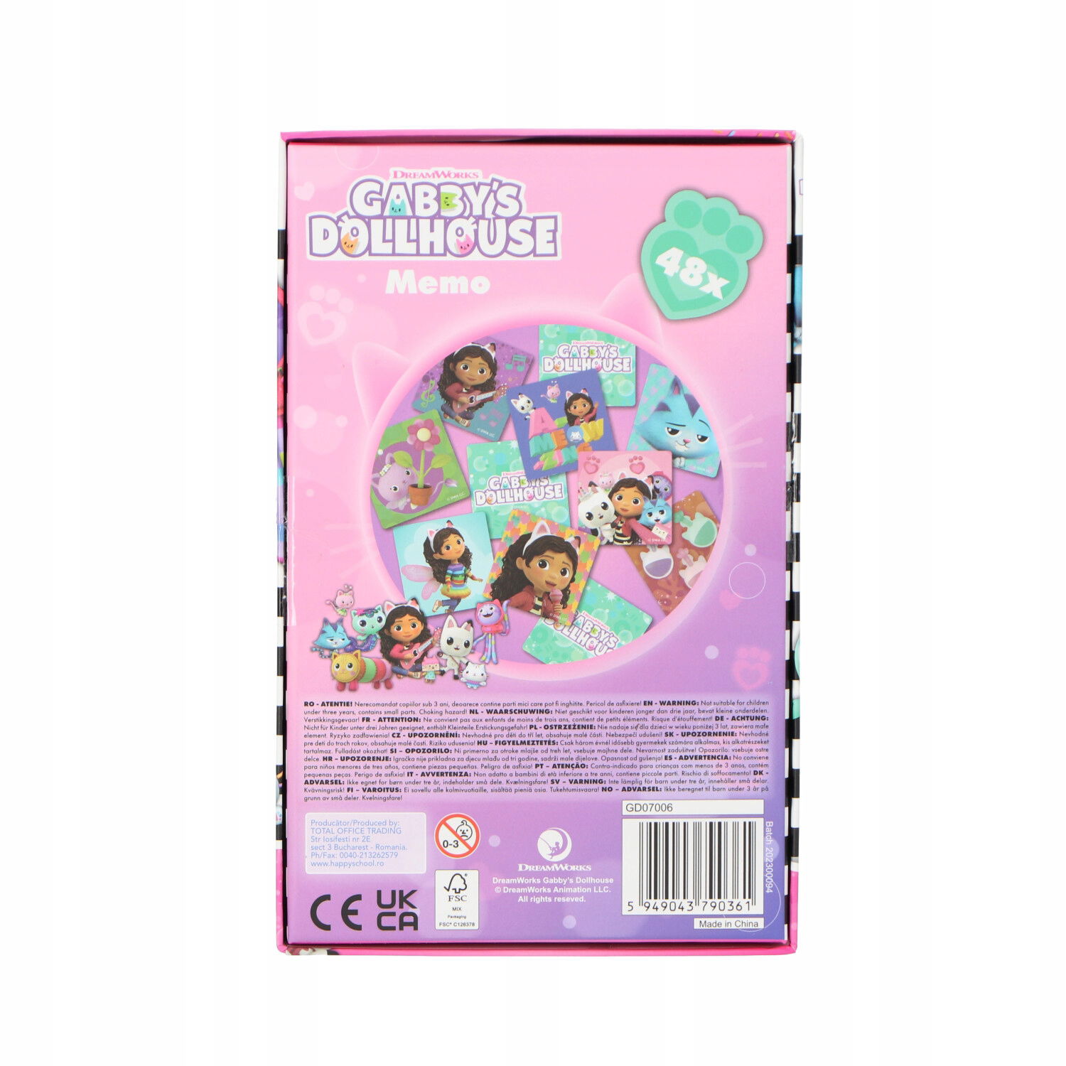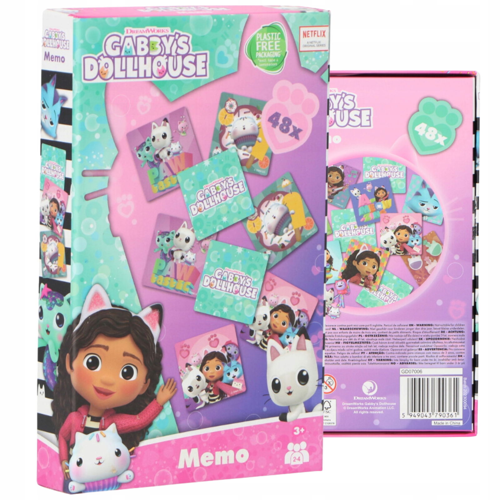 W zestawie znajduje się 48 kart (24 pary) z kolorowymi grafikami inspirowanymi Kocim Domkiem Gabi.