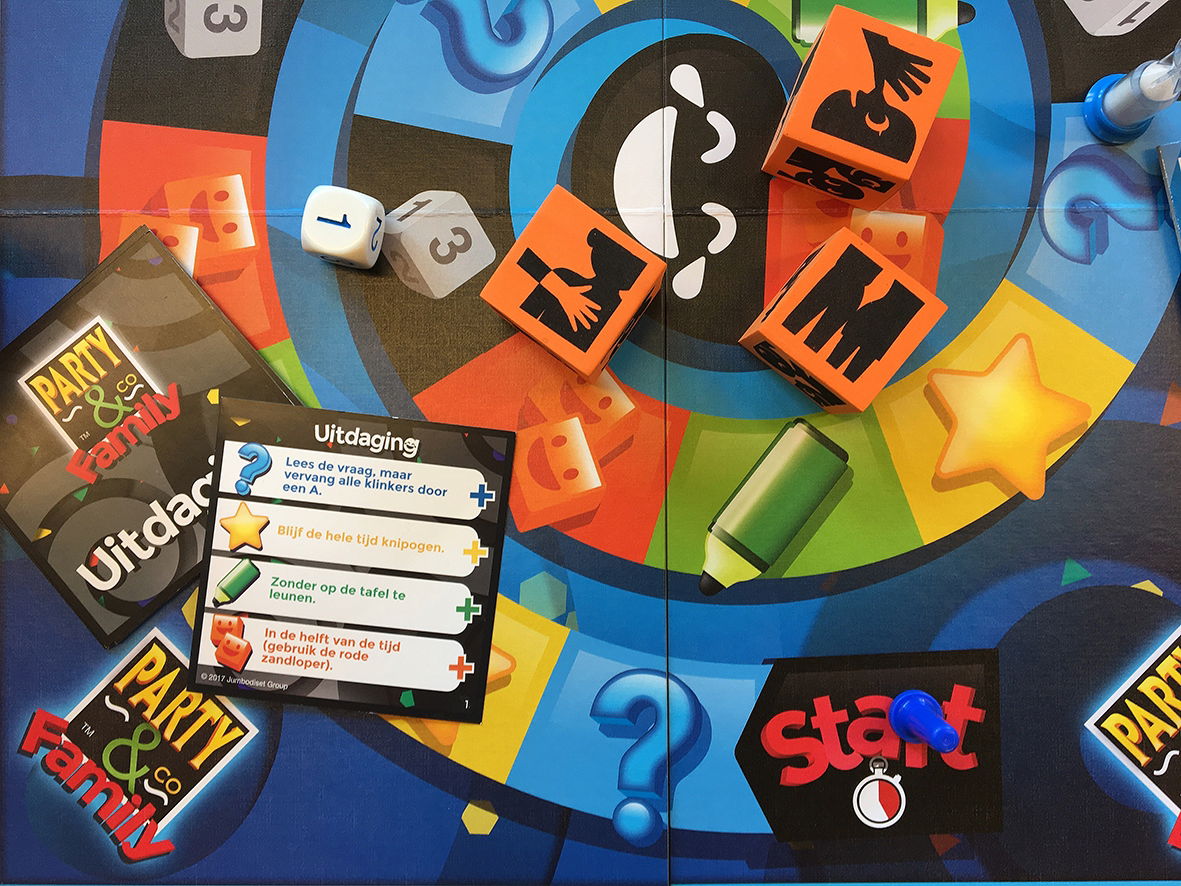 Jumbo Party & Co partyFamily Imituj, rysuj, kręć się po kątach, odpowiadaj na oryginalne pytania i pokonuj najśmieszniejsze wyzwania. Bawcie się dobrze z nową firmą Party & Co. Impreza dla całej rodziny! Gra jest rozgrywana w zespołach lub maksymalnie 3 osobach. Mogą to być zespoły składające się tylko z dorosłych lub tylko z dzieci lub mieszane. To zależy od Ciebie, ponieważ są oddzielne pytania i zadania dla dzieci i dorosłych. Wybierz stronę planszy, z którą chcesz grać: normalny kurs trwa około 50 minut. Krótki kurs trwa około 25 minut. x szer. x gł.) Język: niderlandzki Zawartość: 1 Dwustronna plansza do gry 1 Posiadacz karty 300 Bilety (150 dla dzieci i 150 dla dorosłych) 12 Karty wyzwań 3 Kostki imprezowe 1 PartyDrawboard dwustronny 1 Znacznik zdejmowany 2 Klepsydry 3 lombardy 1 Kostka Zasady gry