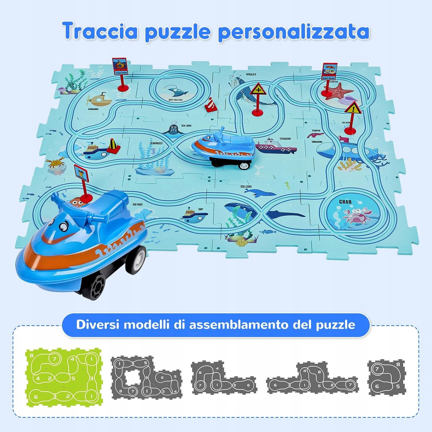 - Zestaw puzzli z wózkiem elektrycznym: Odchodząc od konwencjonalnych puzzli, ten wyjątkowy zestaw do budowy dróg wprowadza wózek elektryczny i zestaw miniaturowych znaków drogowych. Podczas zabawy dzieci mogą zanurzyć się w świecie, w którym nie tylko układają puzzle, ale także promują świadomość dzieci na temat bezpieczeństwa ruchu drogowego, co czyni z tego holistyczną i angażującą przygodę edukacyjną.