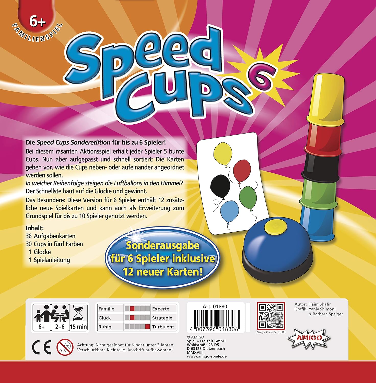 Speed Cups 6 to specjalna edycja bestsellerowej gry zręcznościowej, w której udział może wziąć nawet 6 graczy jednocześnie. To szybka, emocjonująca rozgrywka, w której liczy się refleks, spostrzegawczość i dokładność. Zadaniem uczestników jest jak najszybsze odwzorowanie układu symboli przedstawionych na kartach, przy użyciu kolorowych kubków, a następnie uderzenie w dzwonek. Ten, kto zrobi to jako pierwszy i poprawnie, zdobywa kartę punktową.