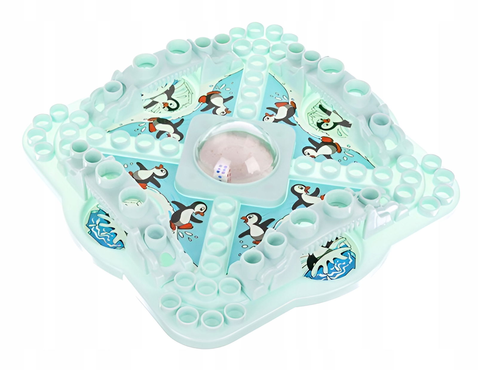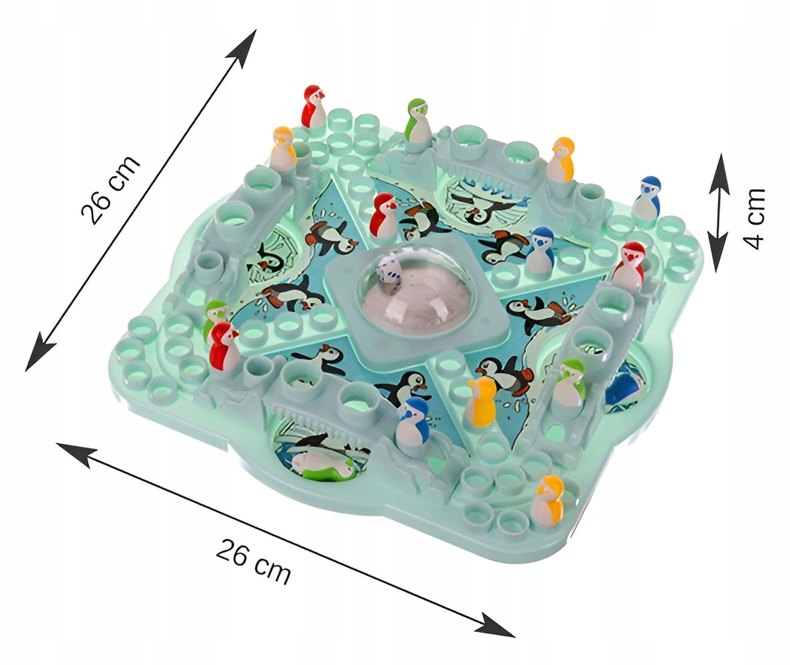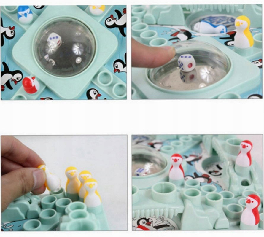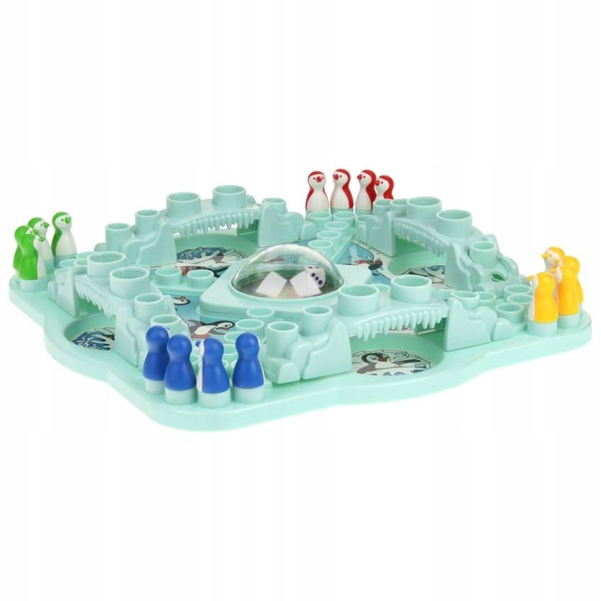 - 16 pionków w kształcie pingwinków (4 czerwone, 4 żółte, 4 zielone, 4 niebieskie)