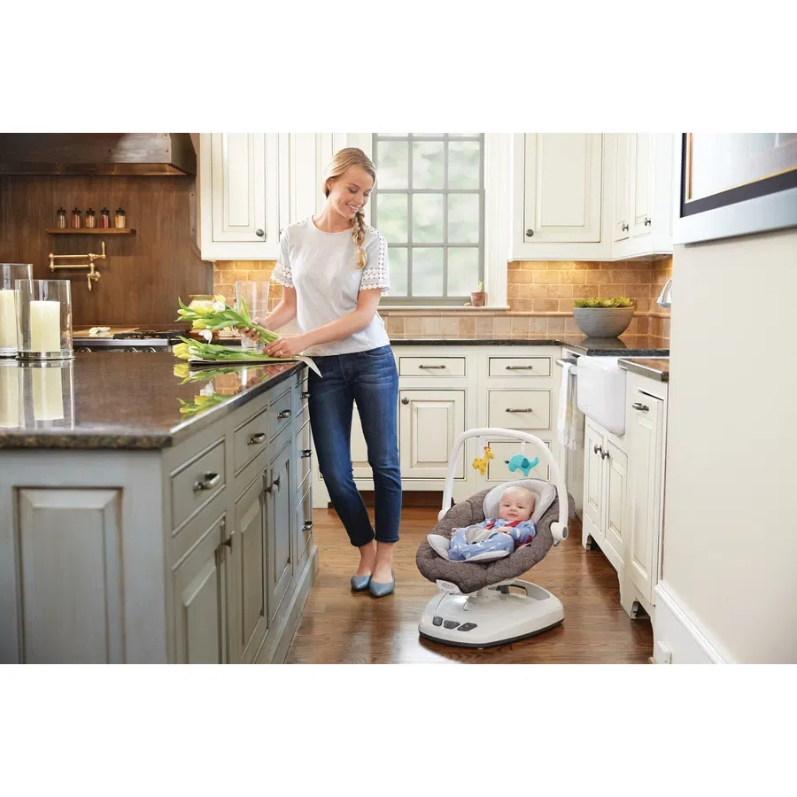 Graco Move With Me jest stworzony po to, aby móc dotrzymać kroku rodzicowi. Dzięki zintegrowanemu uchwytowi do przenoszenia, możemy wygodnie zmieniać położenie huśtawki i manewrować nią pomiędzy pokojami w domu czy mieszkaniu.