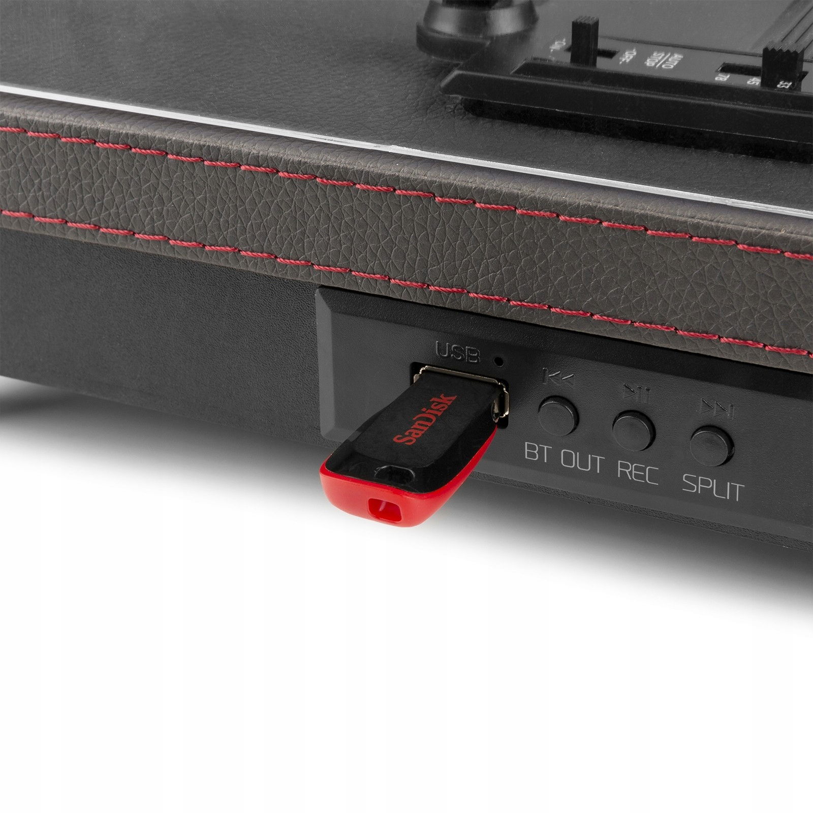 Gramofon z trzema prędkościami może odtwarzać płyty 33, 45 i 78 obr./min i ma nowoczesną skórę PU z luksusowymi przeszyciami.