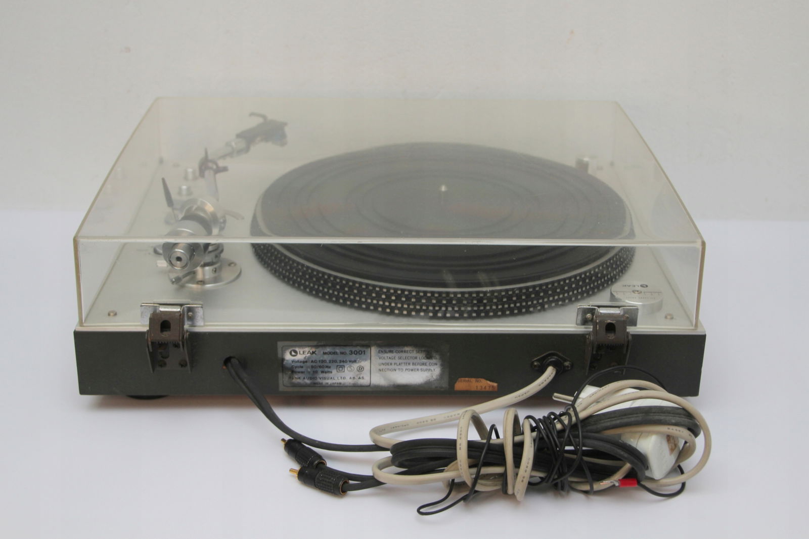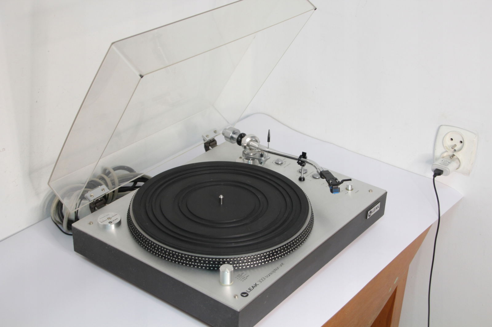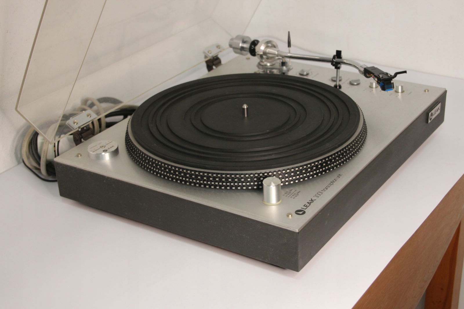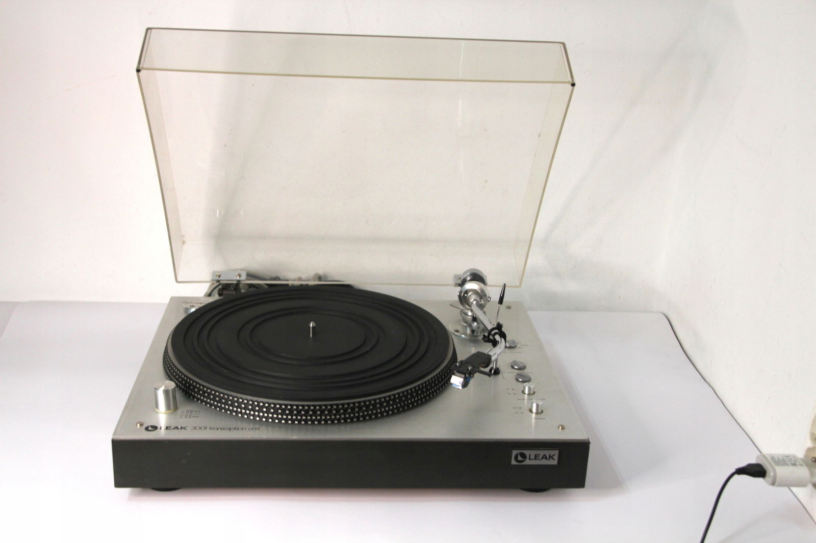 Firma New Rockers oferuje Państwu piękny, w pełni manualny gramofon LEAK 3001 Transcription Unit. Gramofon jest świetnie zachowany, chociaż należy liczyć się z tym, że sprzęt pochodzi z lat '70 ubiegłego wieku, np osłona przeciwkurzowa posiada mikro ryski. Można je spolerować, ale są tak drobne, że raczej nikomu nie będą przeszkadzały. Największą wadą jest drobne wgniecenie prawego rogu (proszę patrzeć na zdjęcia). Gramofon ma zamontowany gruby kabel z końcówkami RCA i wyprowadzone uziemienie. Napęd paskowy pracuje stabilnie i sprzęt doskonale trzyma obroty. Wkładka AT 110E z igłą w bardzo dobrym stanie (zamiennik, ponieważ AT już nie produkuje tej igły). Sprzęt rzadko używany.