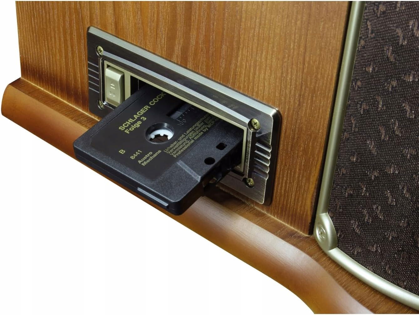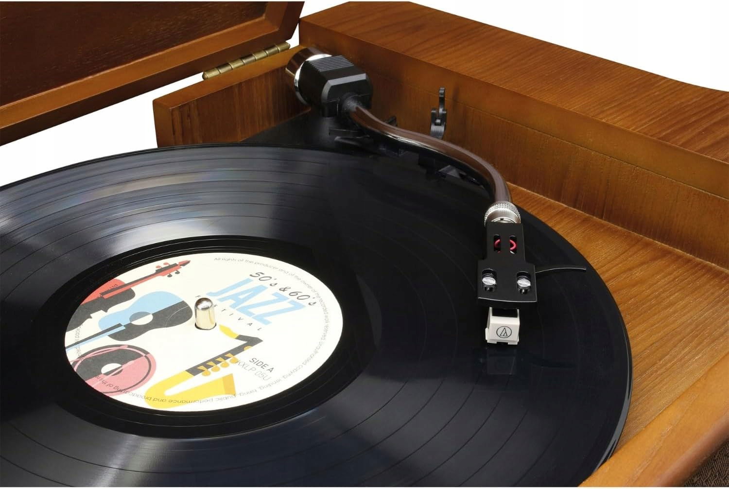 Żaden retro system hi-fi nie byłby kompletny bez odtwarzacza płyt vinylowych. Gramofon może odtwarzać płyty przy 33, 45 i 78 obr./min. Magnetyczny system przetworników, zaprojektowany przez światowej sławy producenta mikrofonów i sprzętu studyjnego Audio Technica, doskonale odwzorowuje najdrobniejsze detale i kolory w dźwięku, co choć subtelne, robi różnicę, szczególnie w przypadku muzyki klasycznej.