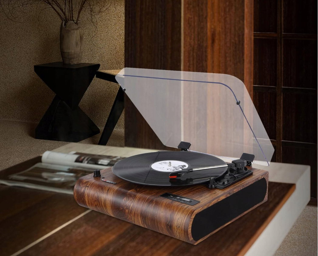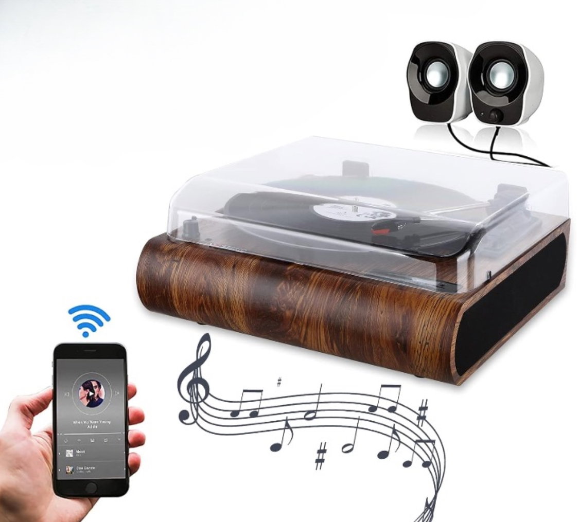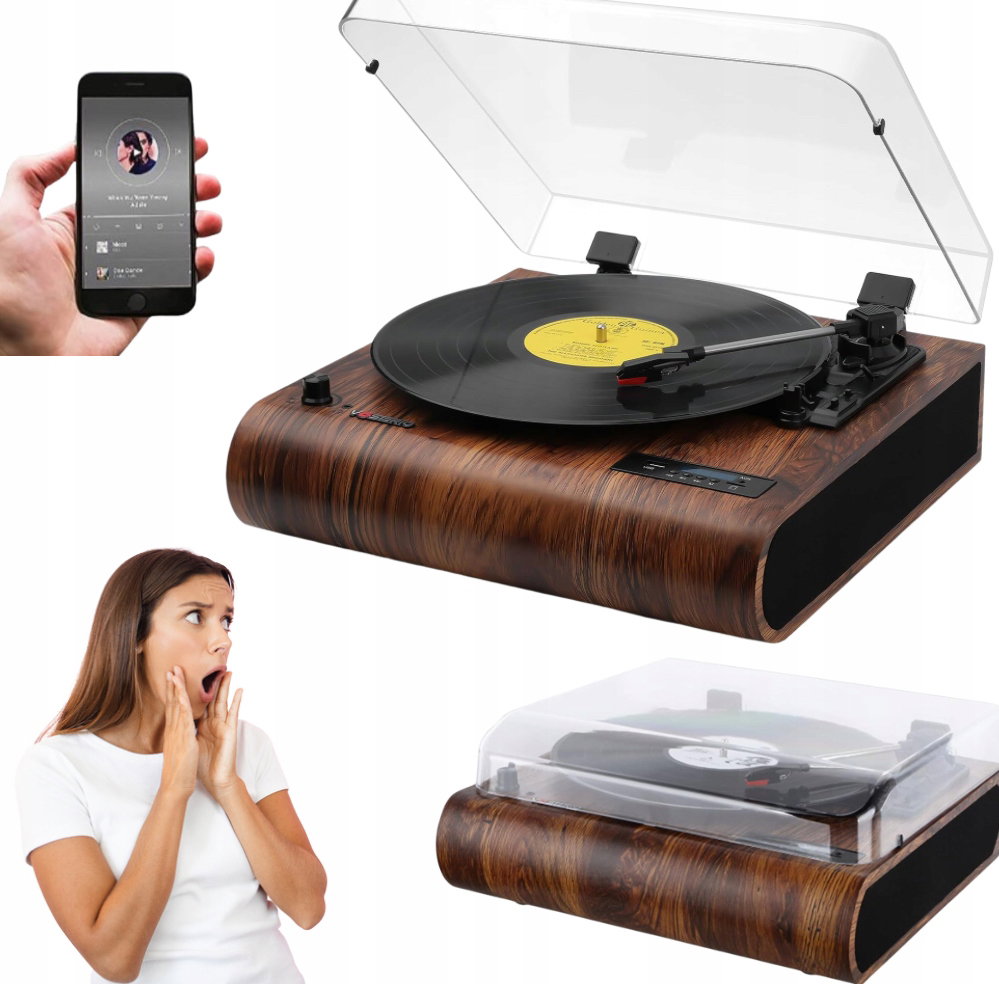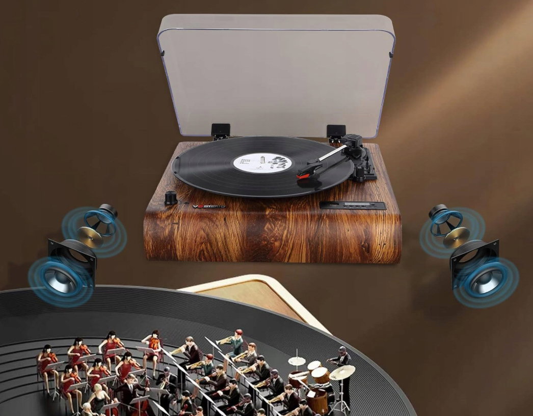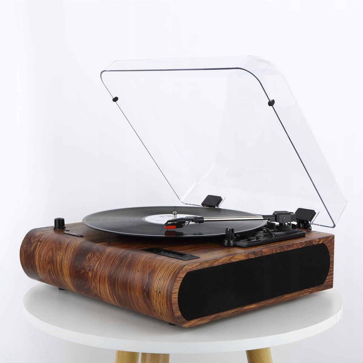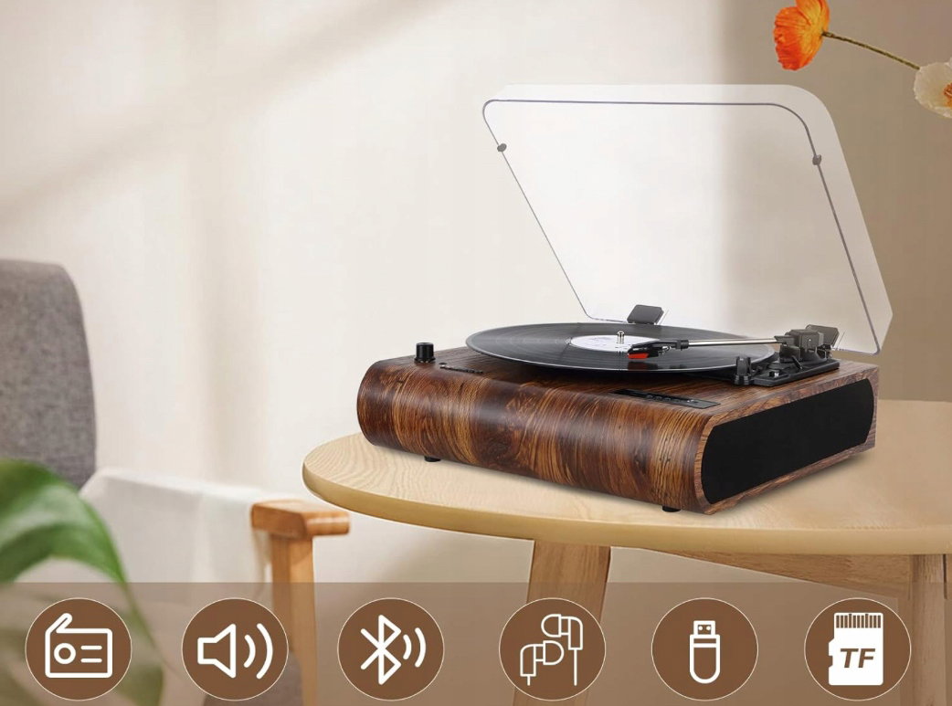 Ten elegancki gramofon w stylu retro nie tylko odtwarza wszystkie rozmiary winyli z trzema prędkościami (33⅓, 45 i 78 obr./min), ale także pełni funkcję głośnika Bluetooth, radia FM oraz odtwarzacza USB/TF/Aux-in.