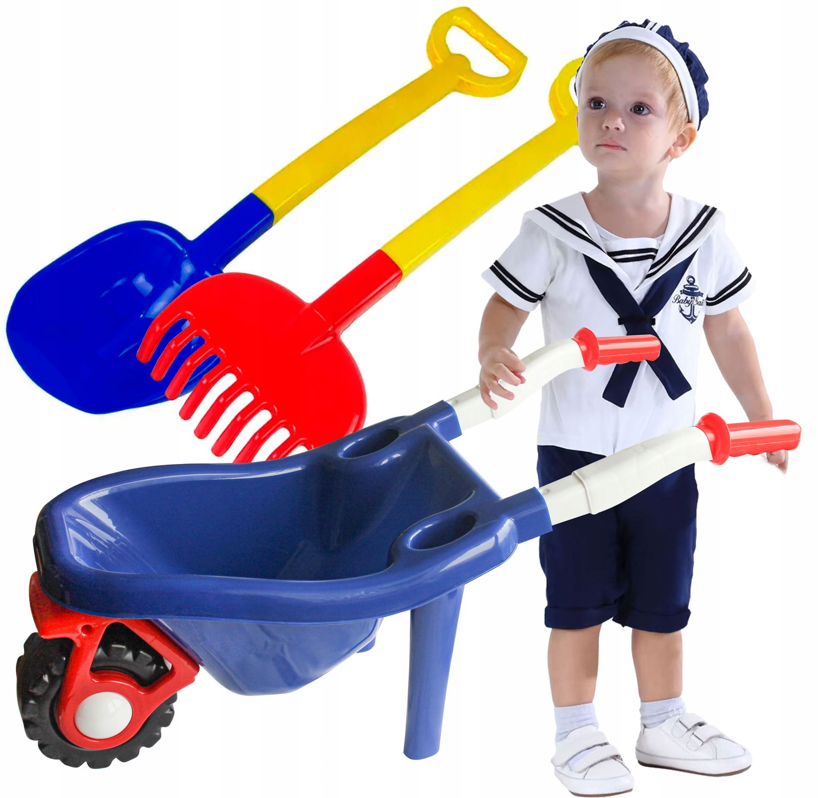 Granatowa Duża taczka ogrodowa na plażę 74cm + Głopata, grabie do piasku