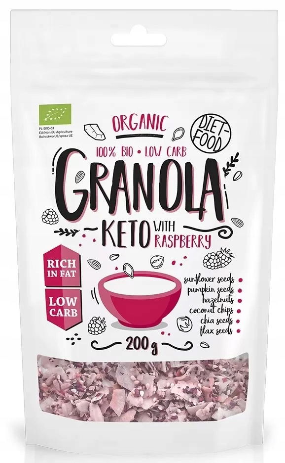 Diet-Food Granole to świetny produkt śniadaniowy zalej go ulubionym mlekiem, jogurtem bądź dowolnym sokiem owocowym, lecz możesz go jeść bezpośrednio z opakowania jako formę przekąski.