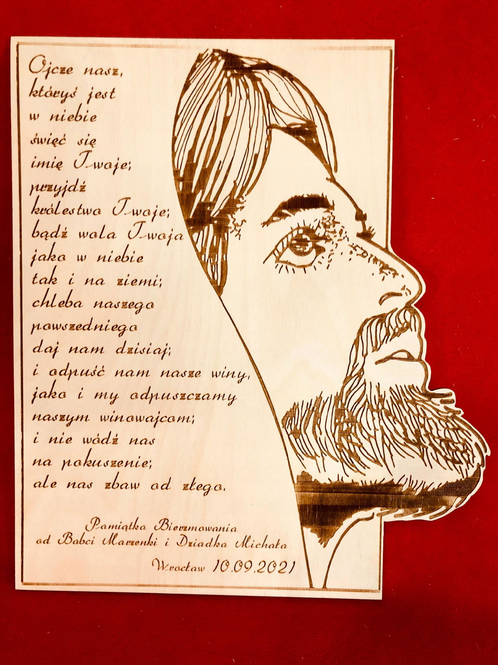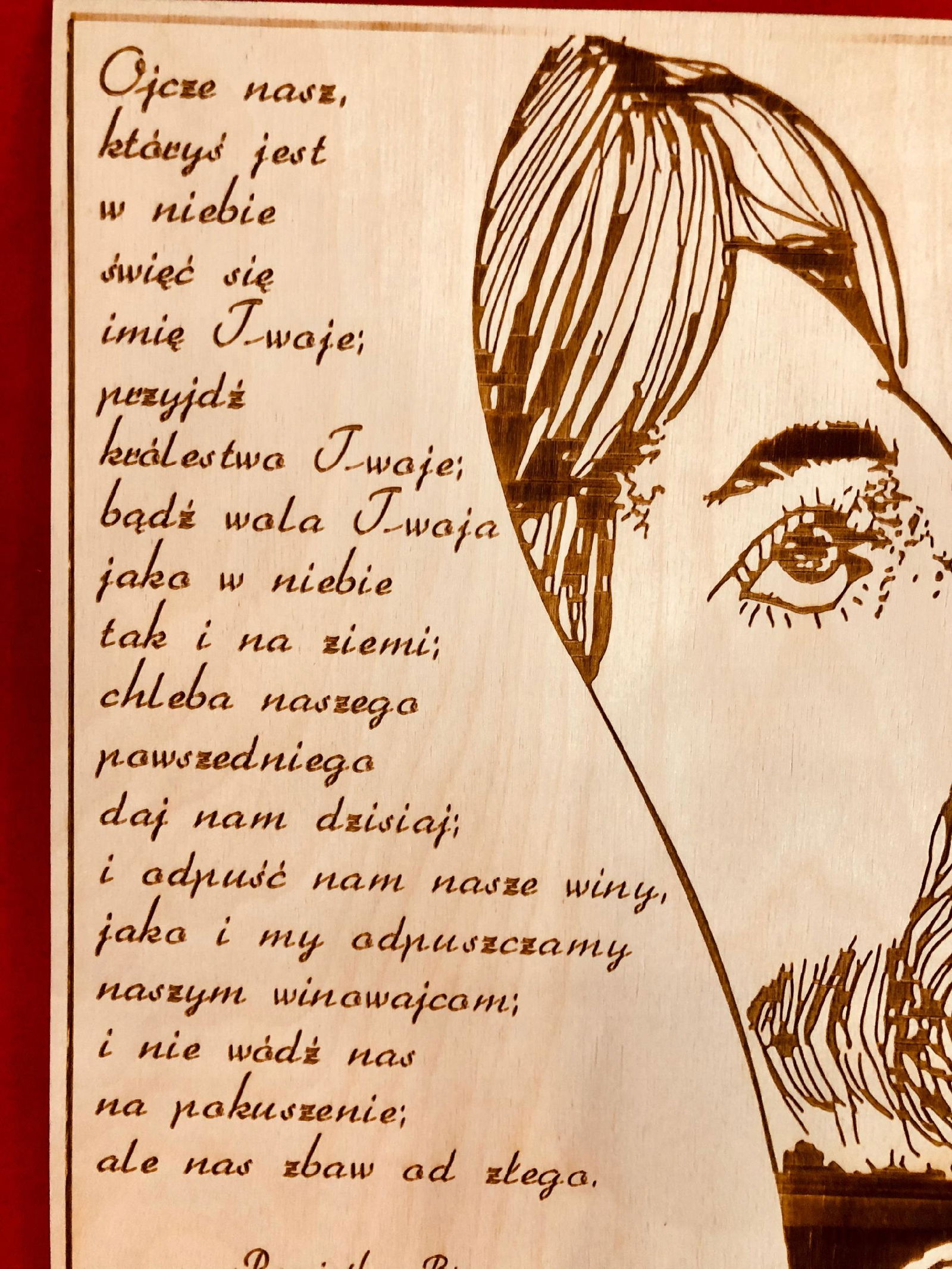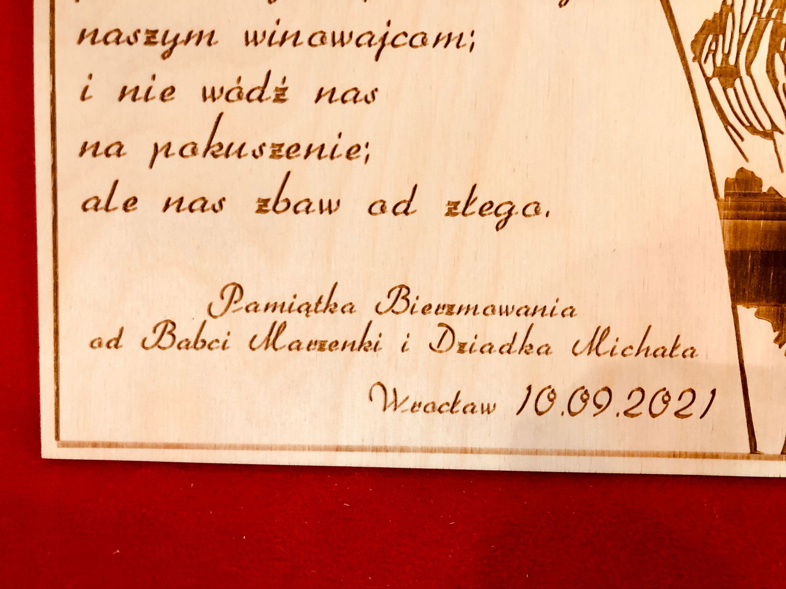 Na obrazie została wygrawerowana laserem modlitwa Ojcze Nasz. Istnieje możliwość zmiany graweru na dowolny tekst.