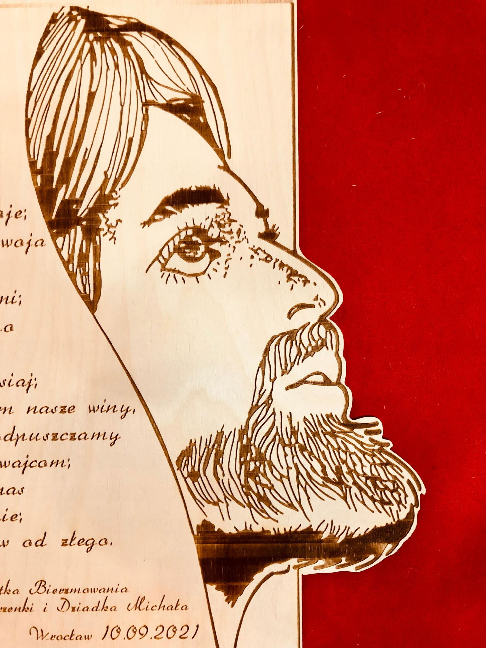 Unikalny obraz Jezusa Chrystusa, grawerowany laserem w sklejce i wykonany w naszej pracowni grawerskiej GRAWERNIADDZ.