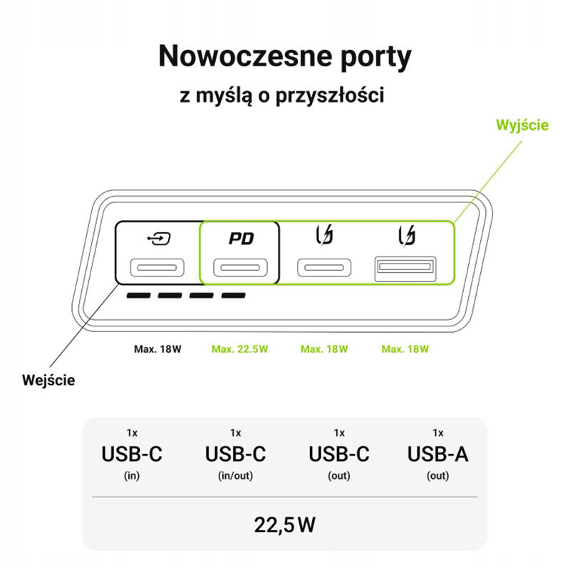 Green Cell PowerPlay20s oferuje zaawansowaną wszechstronność ładowania zgodnie z najnowszymi standardami. Wyposażony w dodatkowe porty USB-C, które obsługują wyższe moce ładowania, oraz zapewnia kompatybilność z szeroką gamą urządzeń. Dzięki temu Green Cell PowerPlay20s staje się centralnym punktem efektywnego i szybkiego ładowania wszystkich Twoich gadżetów.