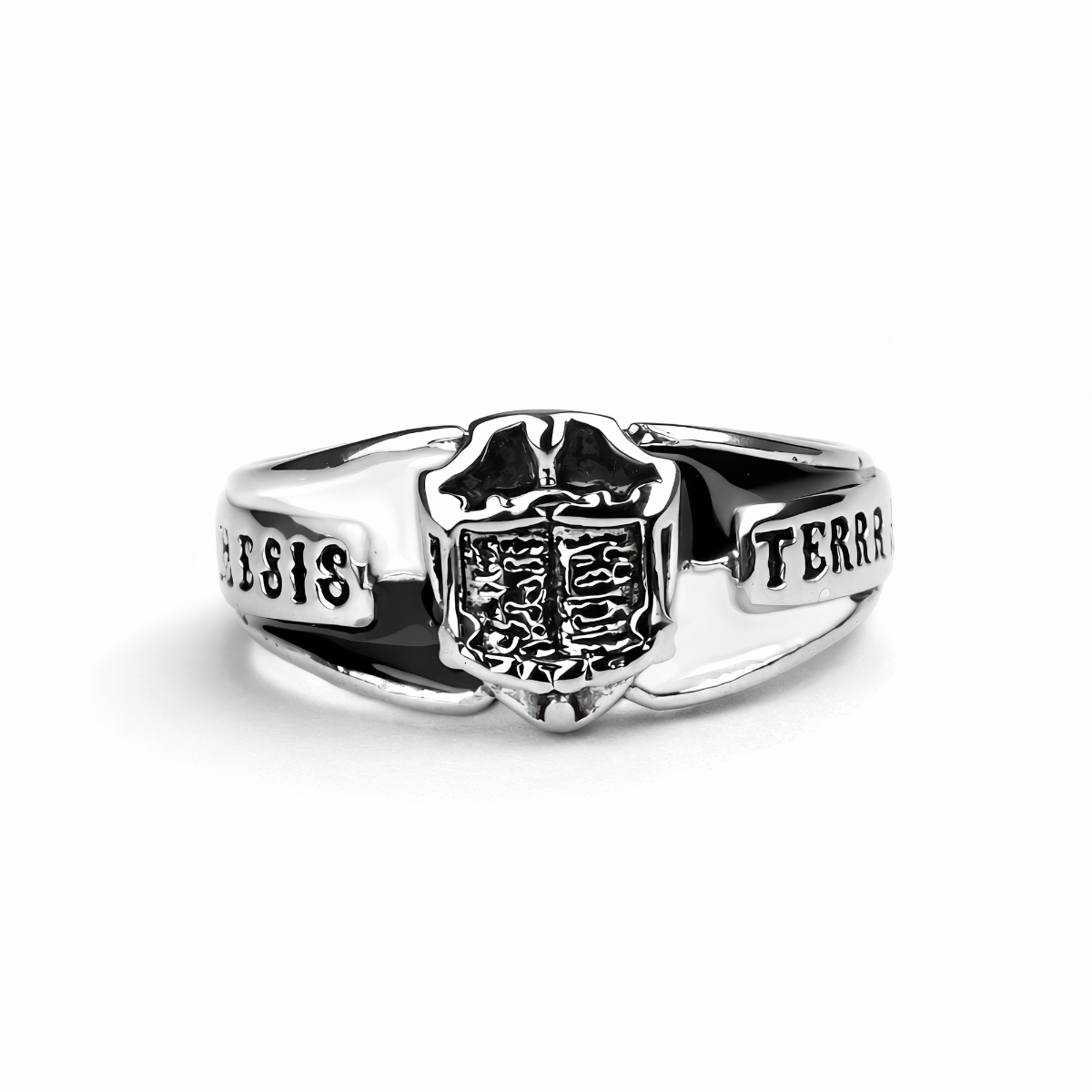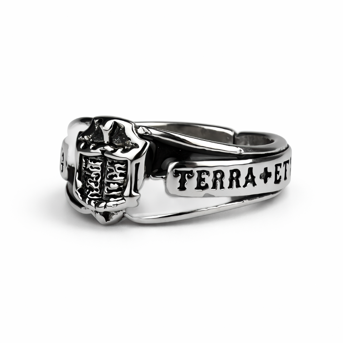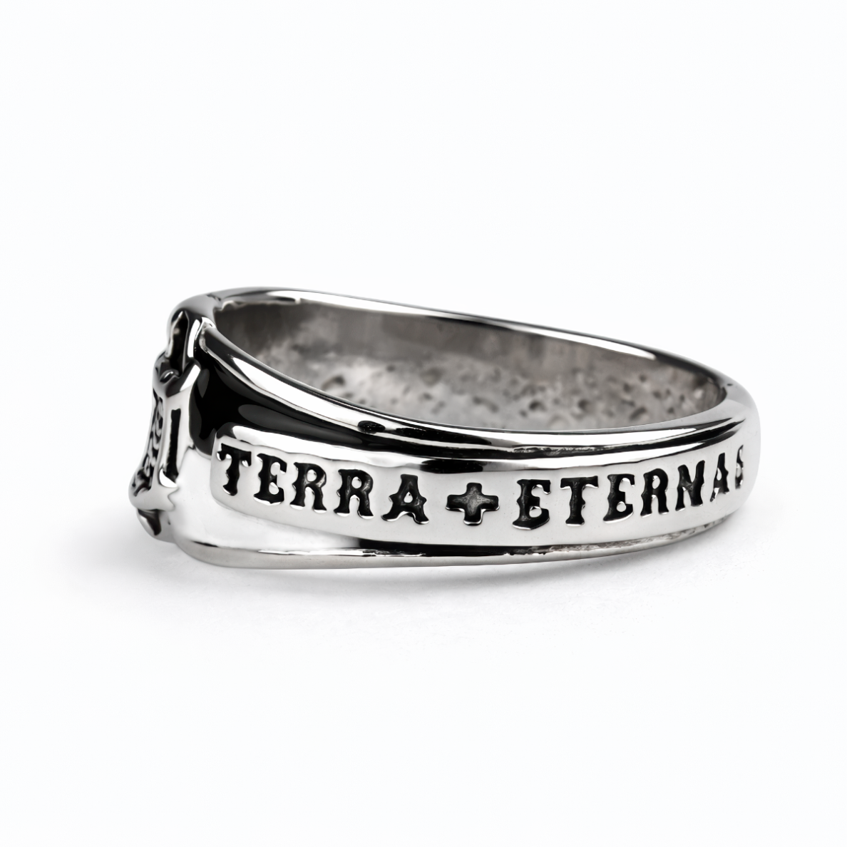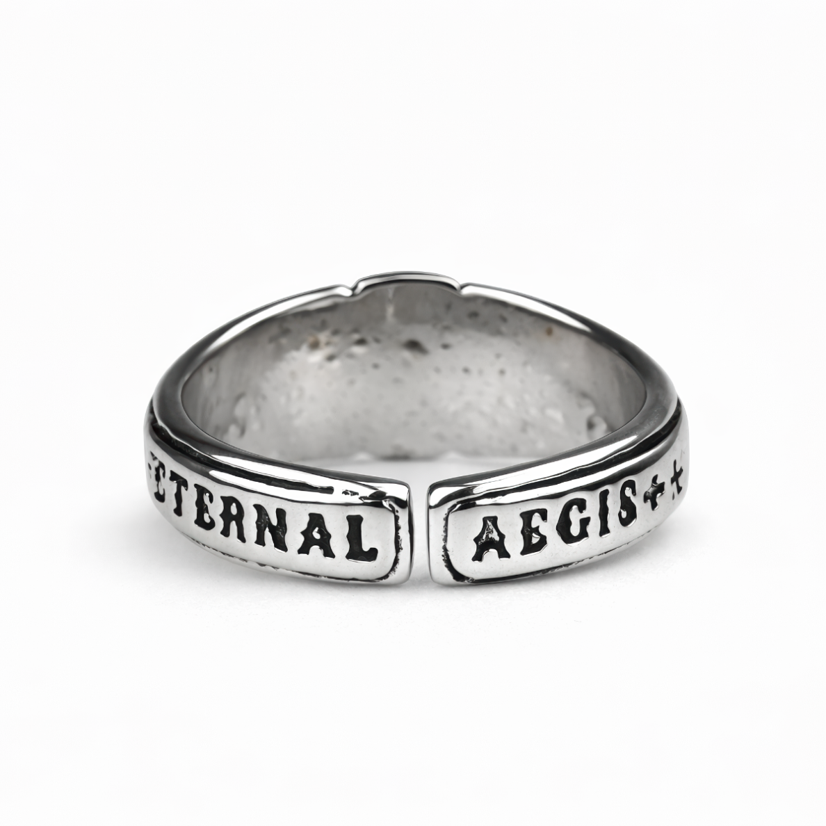 Z komnat na Tytanie prosto na przeklęte fronty 41. tysiąclecia — Grey Knights nie tylko walczą, oni zamykają się w wierze, stali i przysiędze, a ten pierścień Grey Knights pozwala Ci nosić ten klimat na co dzień. Wykonany z metalu o lustrzanym, srebrzystym połysku, z mocno przyciemnionymi zagłębieniami, daje świetny kontrast „uświęconej stali”, który fani kojarzą z klasycznej ikonografii z kodeksów. Obrączka ma regulowany, otwarty fason (Adjustable Size) z wyraźnym rozcięciem z przodu i prostymi zakończeniami, które eksponują napisy: z jednej strony „ETERNAL”, z drugiej „AEGIS++”, jak ślubowanie wyryte w pancerzu. Na boku widać też „TERRA + ETERNAL” w wypukłych literach z ciemnym wypełnieniem oraz oznaczenie „8818”, które dodaje całości fajnego, „reliktowego” charakteru. Centralnie znajduje się masywny herb z otwartą księgą o fakturowanych „stronach” i skrzydlatą sylwetką u góry, zrobiony w wyraźnym reliefie, więc pięknie łapie światło przy każdym ruchu. Dzięki regulacji możesz nosić go na różnych palcach — do cosplayu, do codziennego outfitu z subtelnym akcentem Warhammer 40k albo jako element kolekcji. Jeśli chcesz mieć przy sobie coś, co wygląda jak osobista pieczęć ochronna przeciwko Osnowie, ten pierścień jest gotowy wskoczyć na Twoją dłoń.