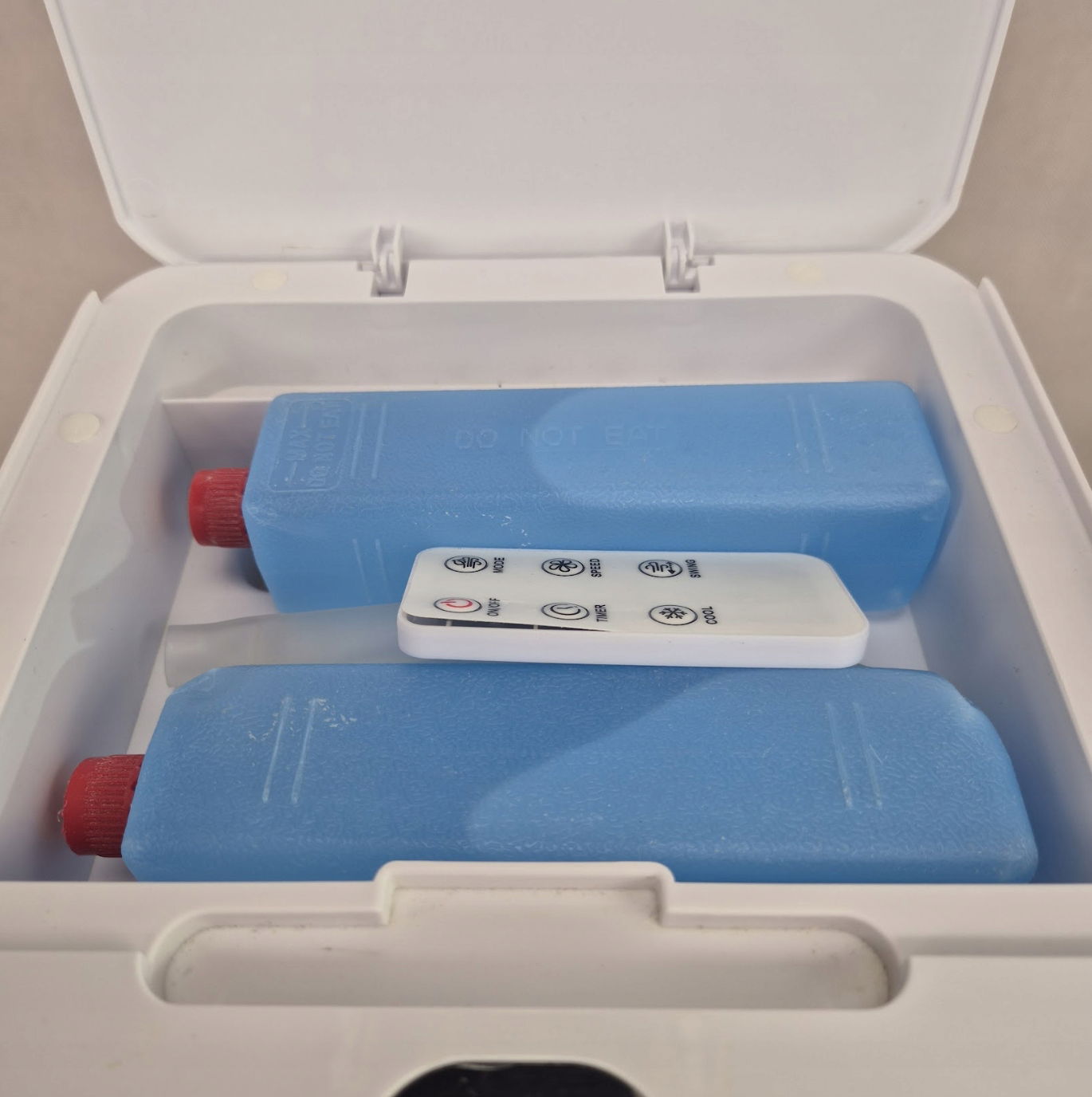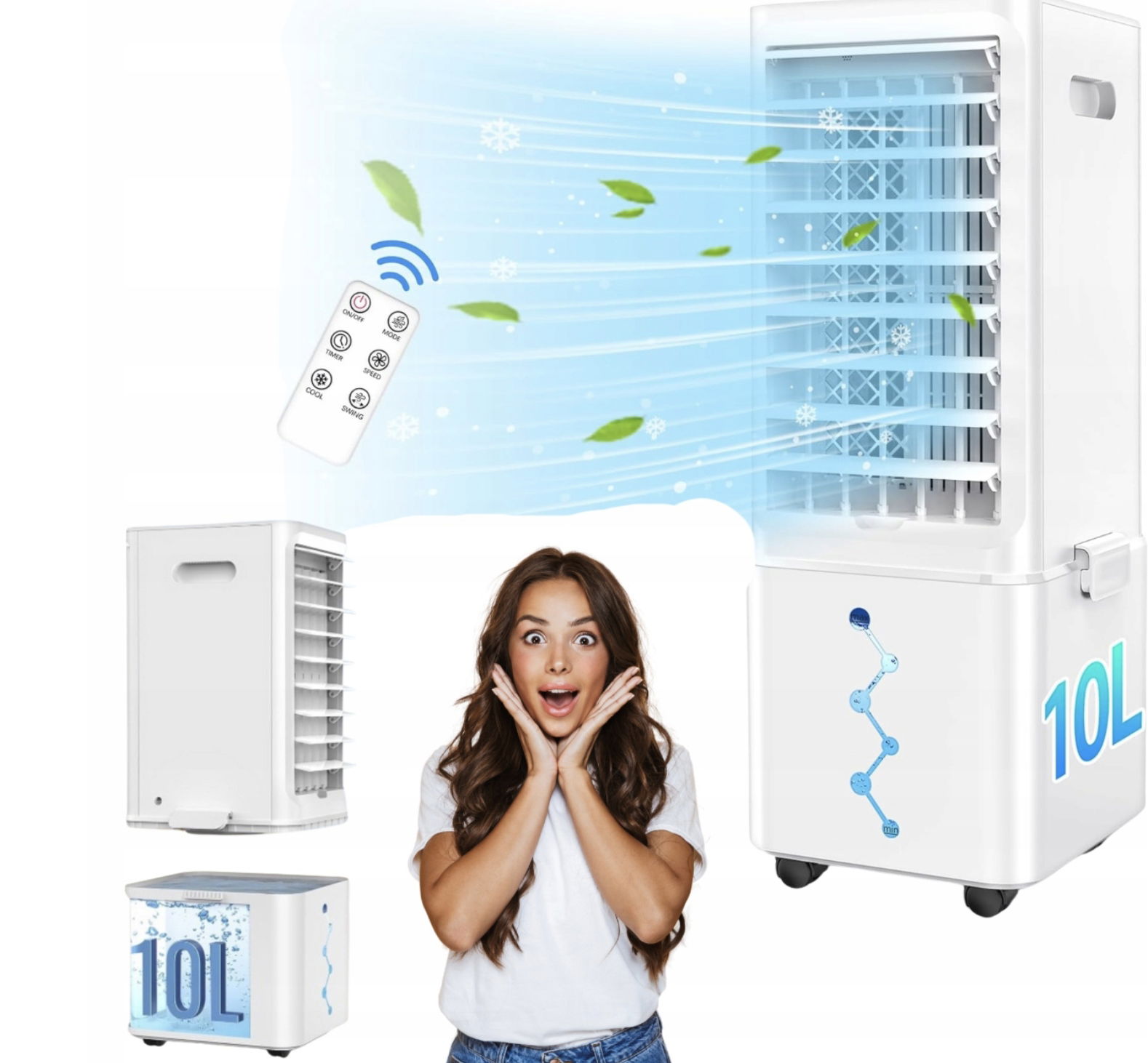 Odświeżacz powietrza wyposażony jest w duży zbiornik na wodę o pojemności 10 litrów i 2 opakowania lodu.