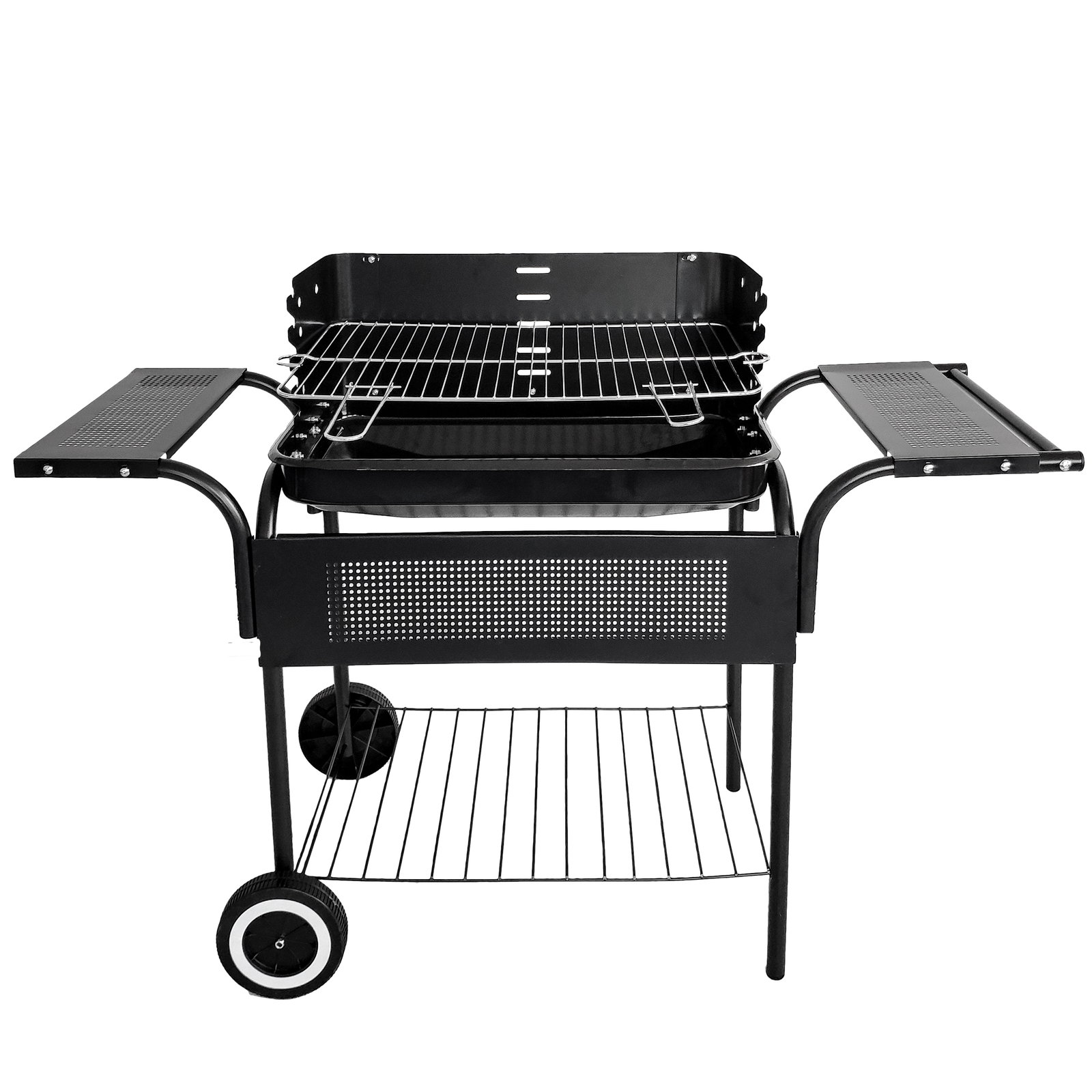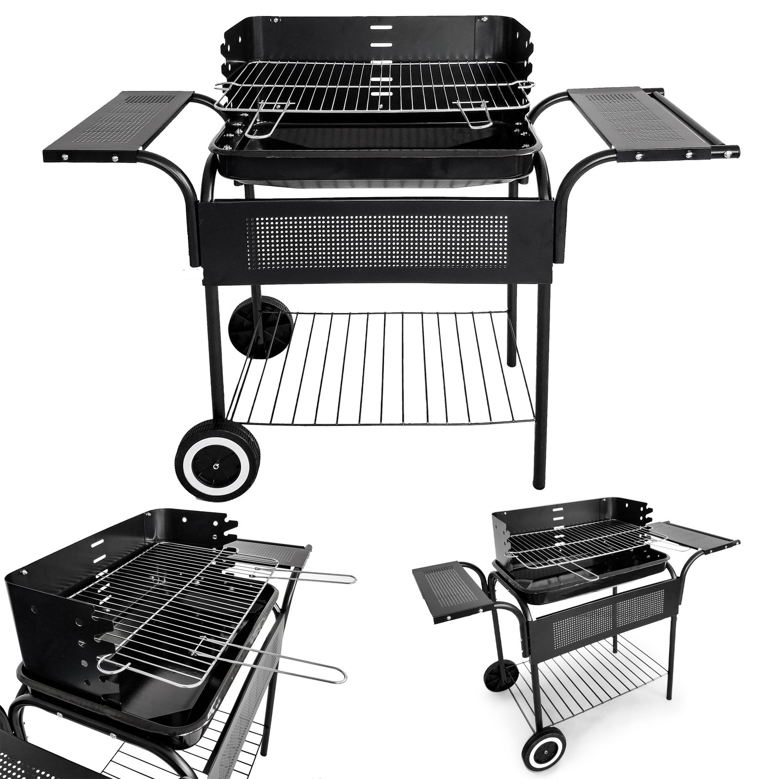- Grill wyposażony jest w 3 funkcjonalne półki, dzięki nim wszystko będzie pod ręką. Duża, dolna półka pomieści zapas węgla, rozpałkę i inne niezbędne rzeczy. Na mniejszych półkach możesz ustawić talerze z przygotowanymi do grillowania potrawami, co ułatwi ich nakładanie.