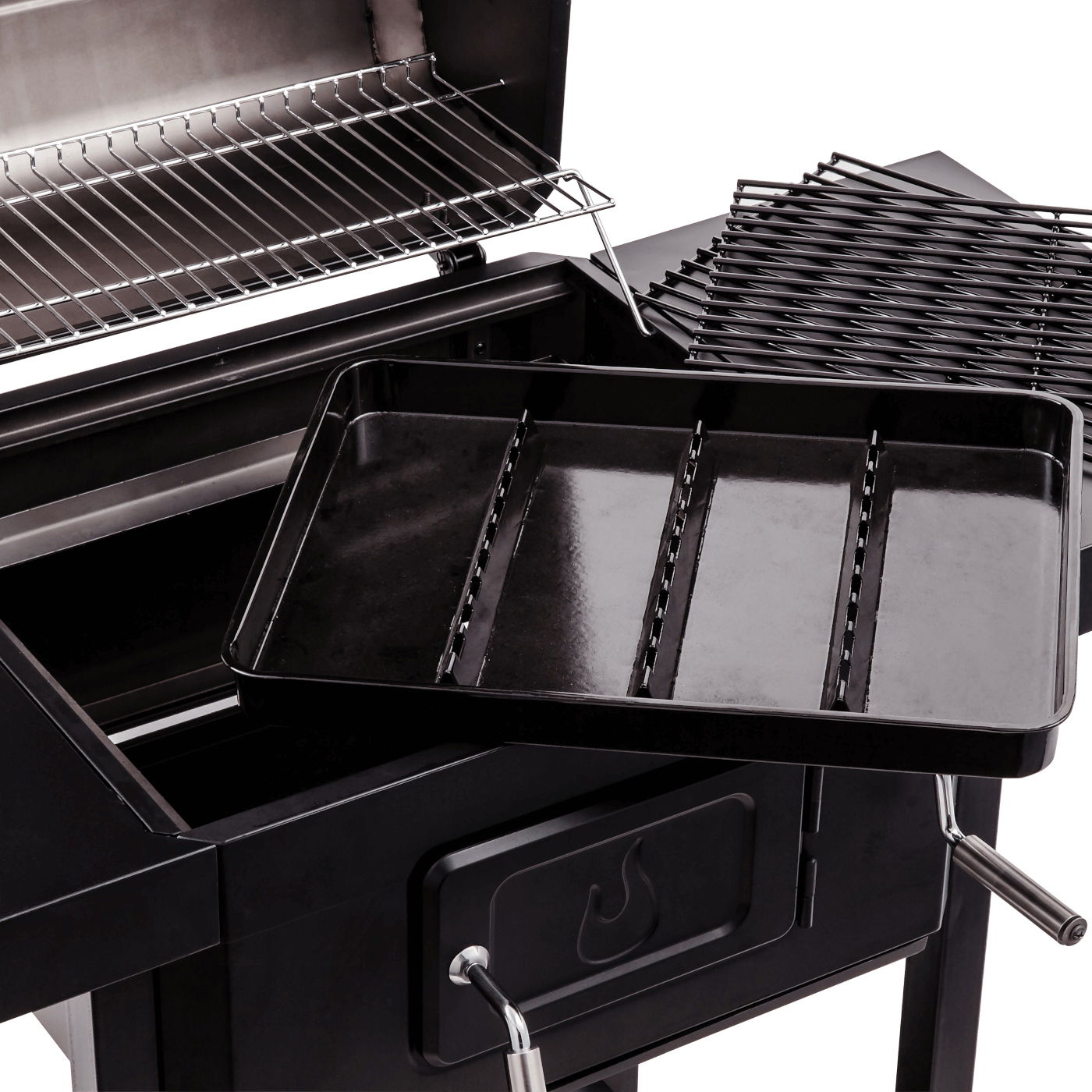 Nowa technologia gotowania w grillach węglowych Char-Broil wykorzystuje opatentowaną tackę, która ułatwia kontrolowanie temperatury gotowania, zapewniając bardziej wydajne spalanie i mniej marnowanego ciepła. Technologia ta pozwala uzyskać pożądane rezultaty gotowania bez uszczerbku dla wrażeń z grillowania. Taca ogniowa ma zewnętrzną korbę do indywidualnych ustawień wysokości, co umożliwia idealną kontrolę grilla. Boczny zawór powietrza pomaga w maksymalnej kontroli cyrkulacji powietrza podczas grillowania w wysokich temperaturach przez długi czas. Tackę na węgiel drzewny można łatwo wyjąć i można ją łatwo wyczyścić. Model 2600 jest mniejszym grillem.