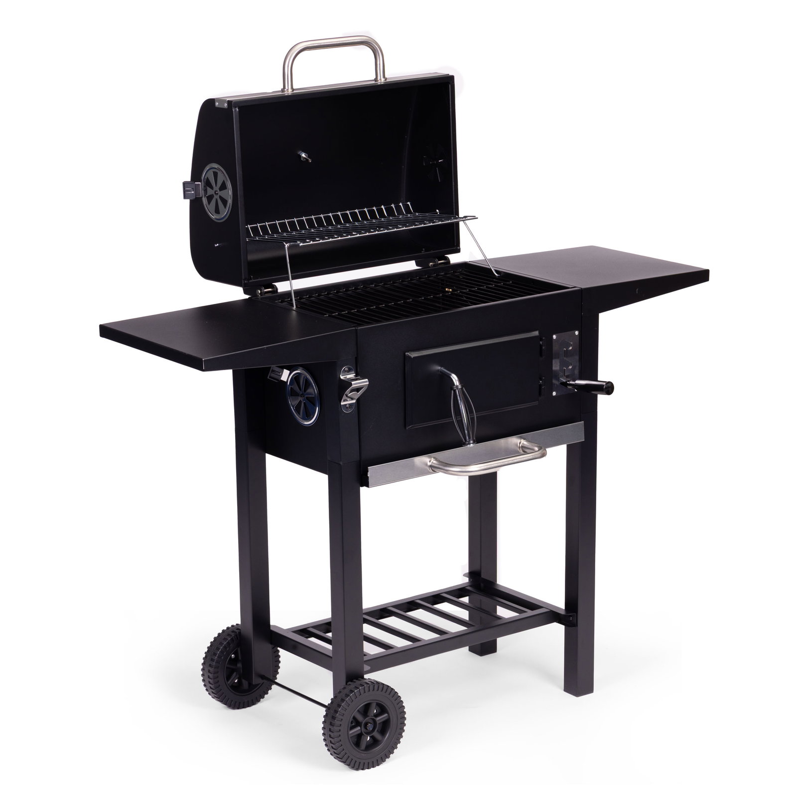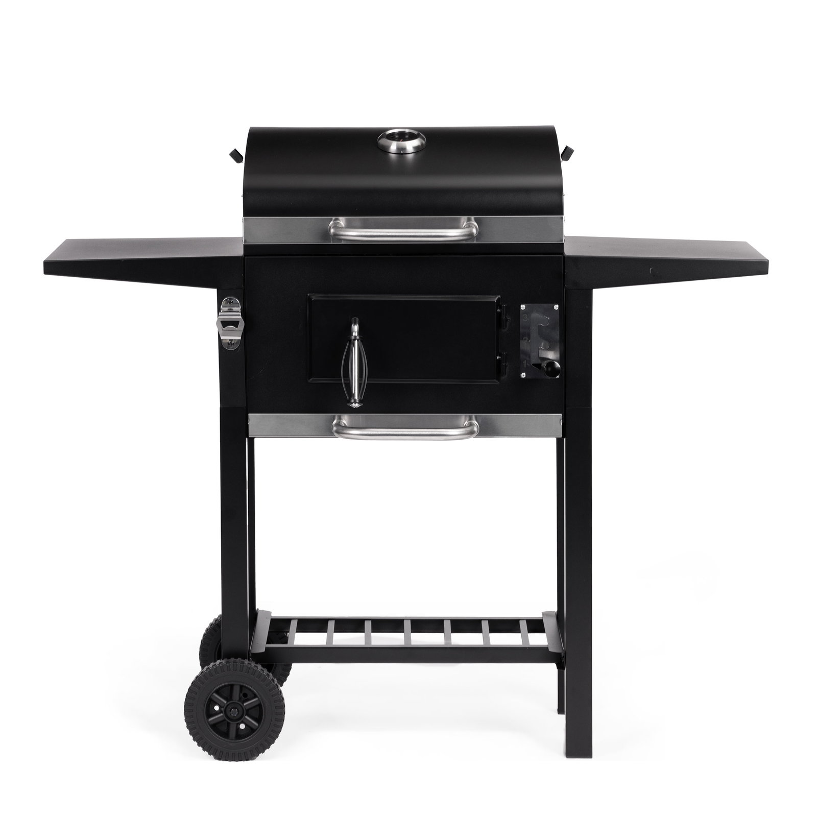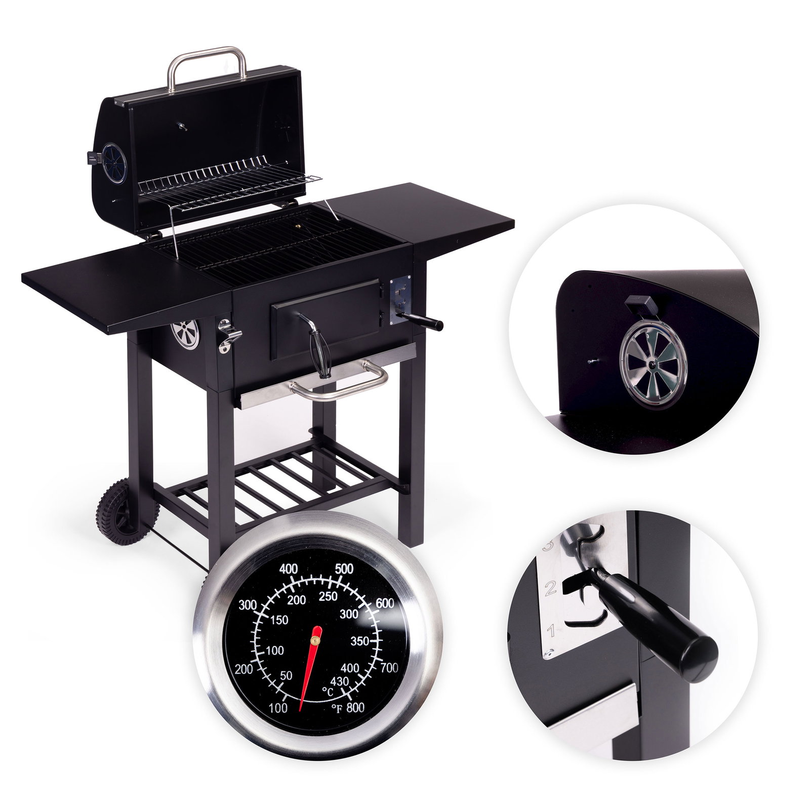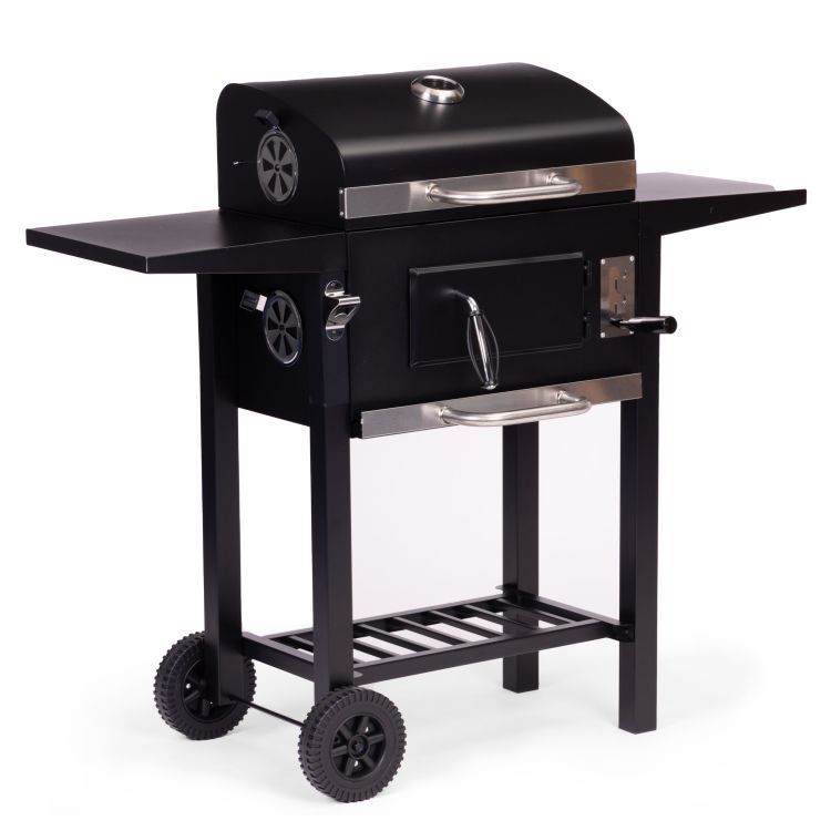 - Całość uzupełniają dwie boczne półki o wymiarach 33×29 cm, które oferują wygodną przestrzeń na akcesoria, przyprawy oraz przygotowane potrawy, usprawniając organizację podczas grillowania.