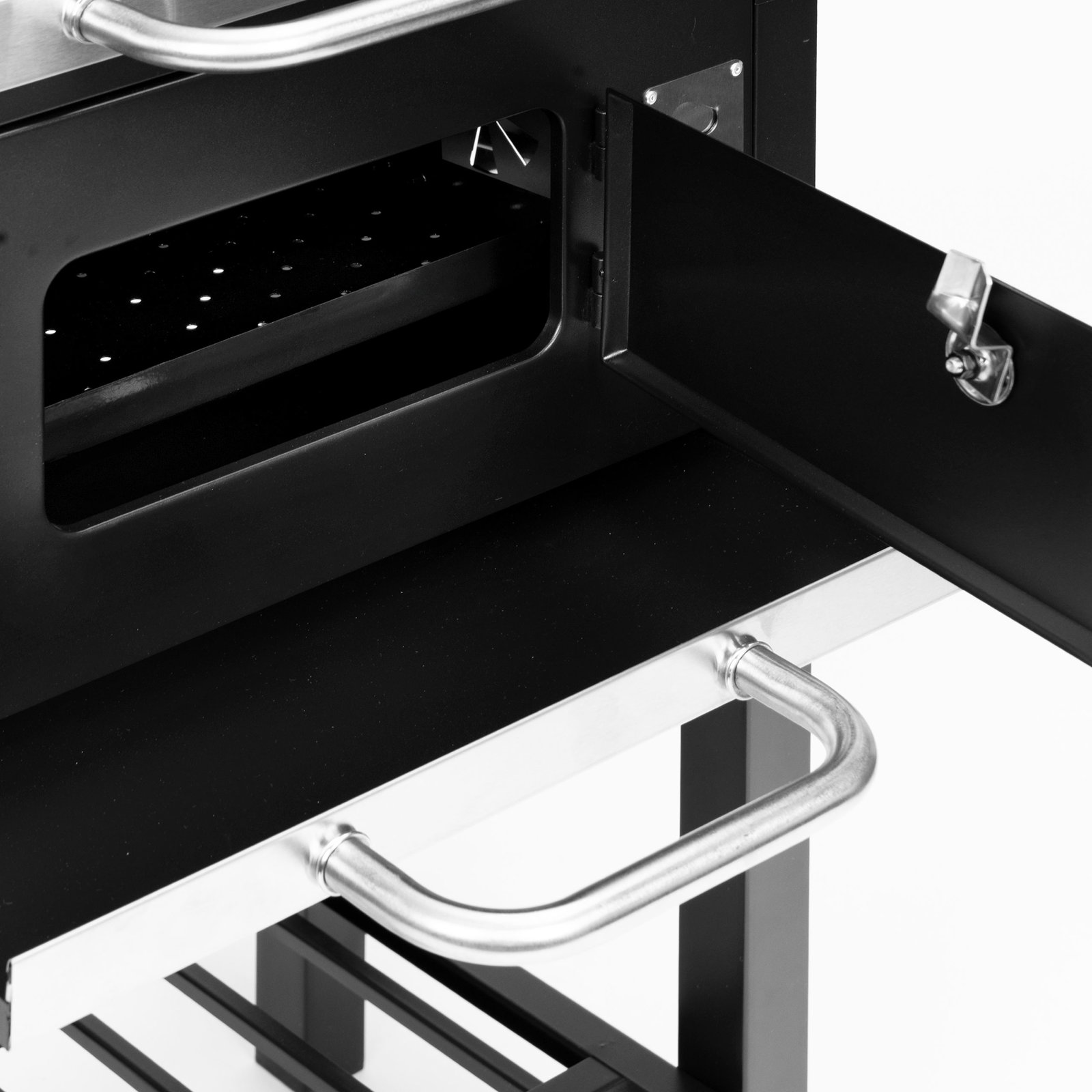 - Drzwiczki paleniska z wygodnym uchwytem zapewniają łatwy i szybki dostęp do wnętrza grilla.