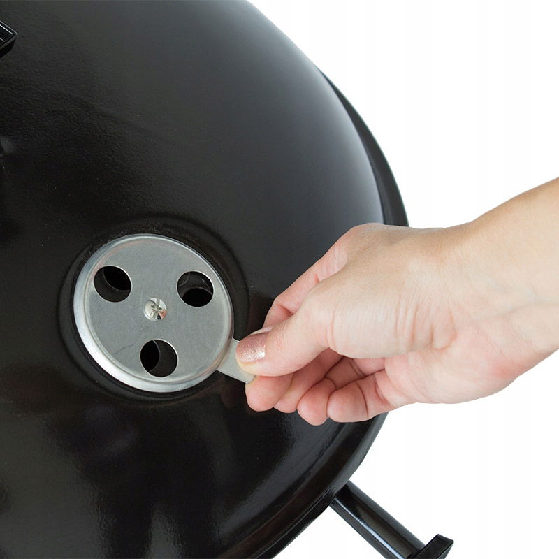 Przykrywka wyposażona została w rączkę, wentylacje oraz wewnętrzny hak na którym można powiesić przykrywkę na grillu gdy jej nie potrzebujemy.