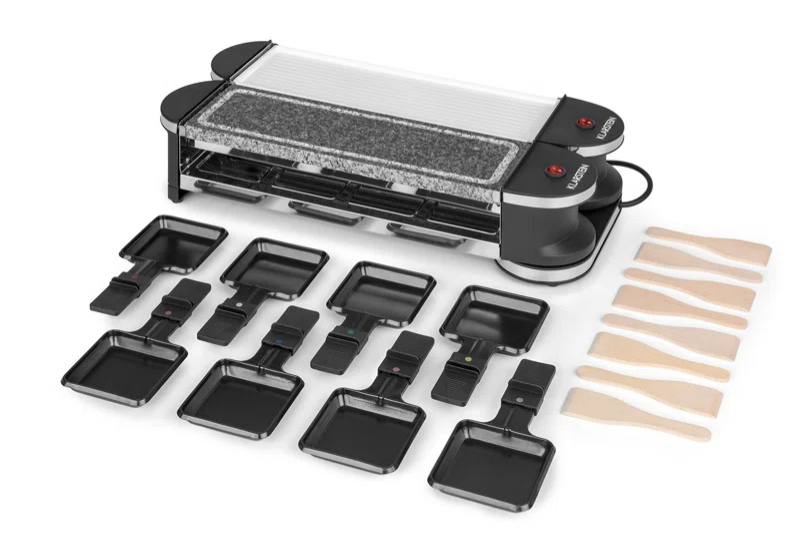 Grill elektryczny oferuje 8 patelni do zapiekania, metalową płytę grillową do smażenia oraz płytę wykonaną z kamienia naturalnego do grillowania o niskiej zawartości tłuszczu.