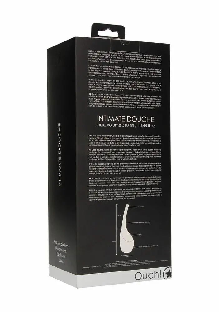Ten natrysk Intimate Douche , wykonany z wysokiej jakości pcv sprawi, że intensywne czyszczenie będzie efektywne i przyjemne zarazem! Napełnij zbiornik letnią wodą ściskając piłeczkę i pozwól jej zassać wodę. Następnie wprowadź i ściśnij piłkę, aby z łatwością wypuścić jej zawartość. Higieniczny i przyjemny zarazem, ten natrysk o eleganckim wyglądzie jest odpowiedni zarówno dla niego jak i dla niej!Wymiary opakowanie 29,70 x 13 x 9,50 cmWaga opakowanie 315 gramWymiary produktu 25 x 9 x 8,6 cmMasa produktu 178 gramObjętość produktu 310 mlŚrednica produktu 2 cmWprowadzana długość 14 cmWodoodporność TakMateriały PVC