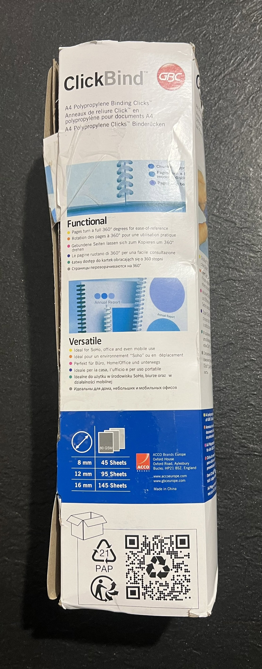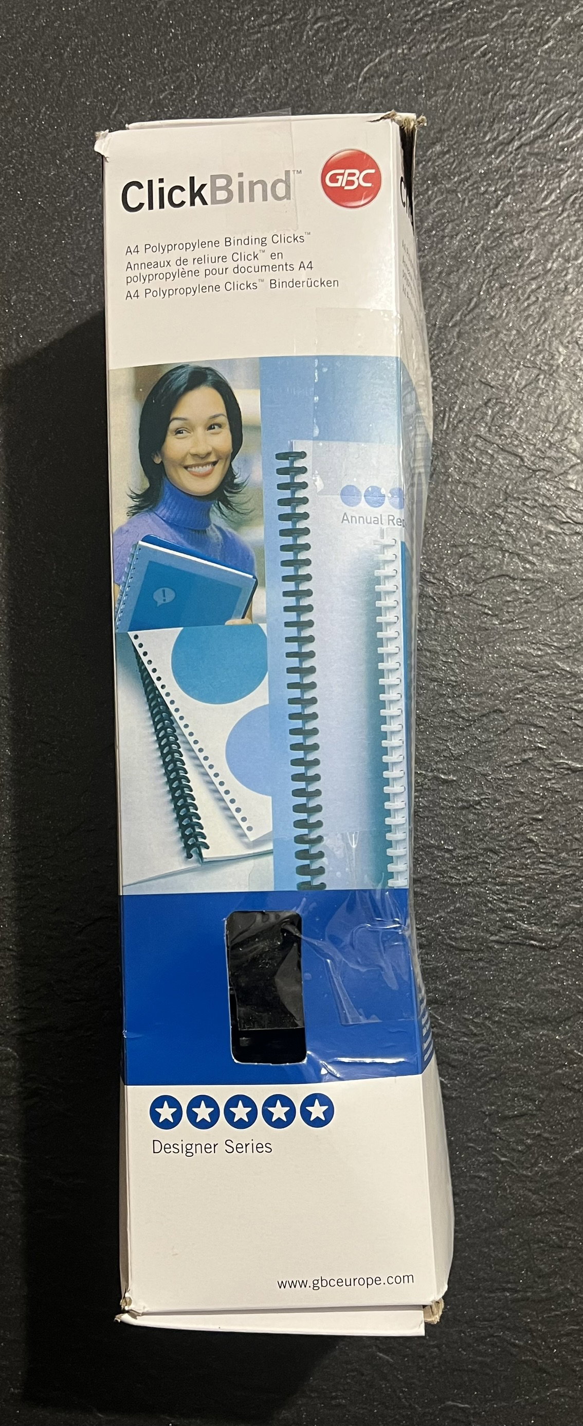 Grzbiety GBC ClickBind są wytrzymałe i zapewniają stylową oprawę dokumentów. Są kompatybilne z bindownicami ClickBind i WireBind