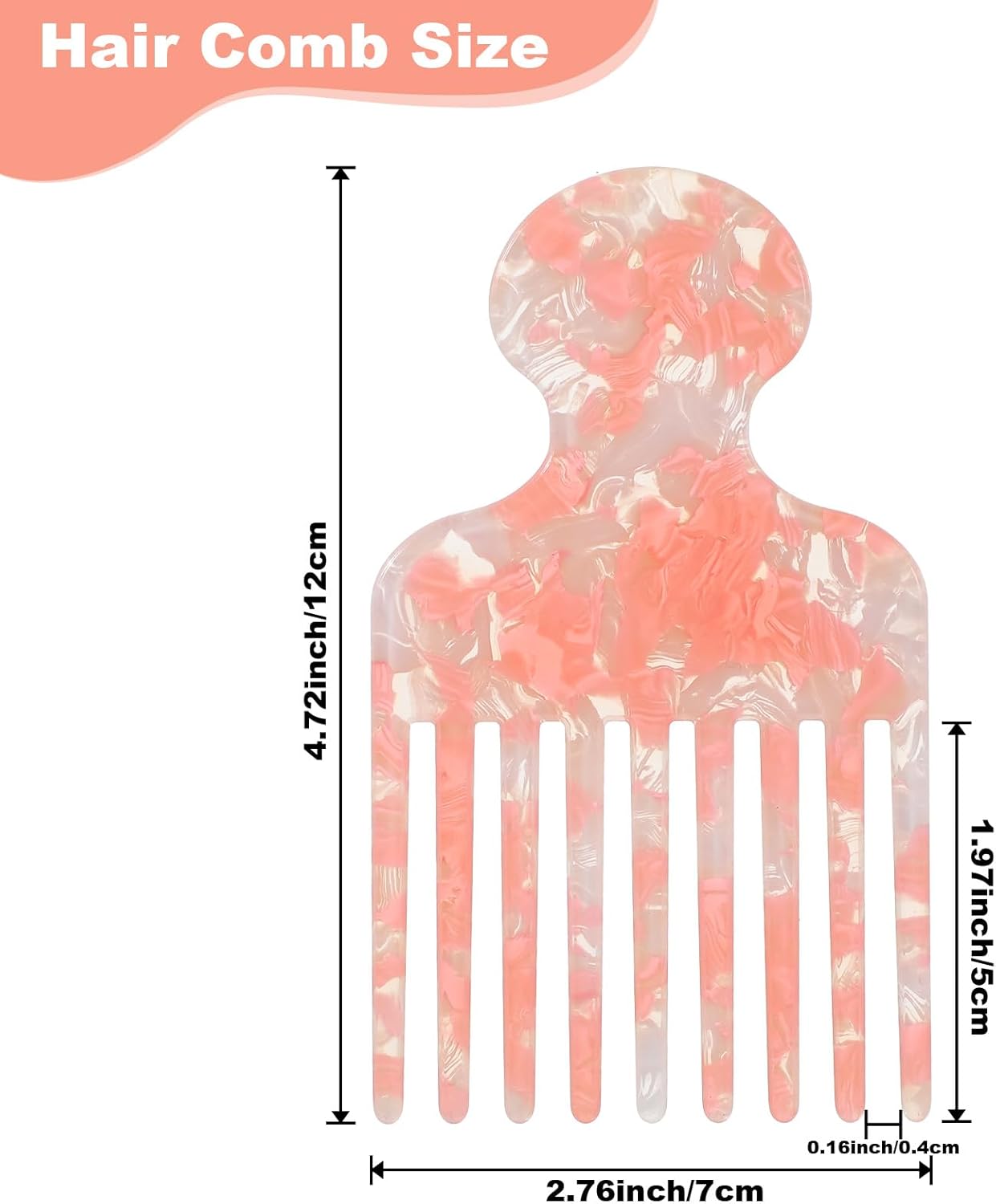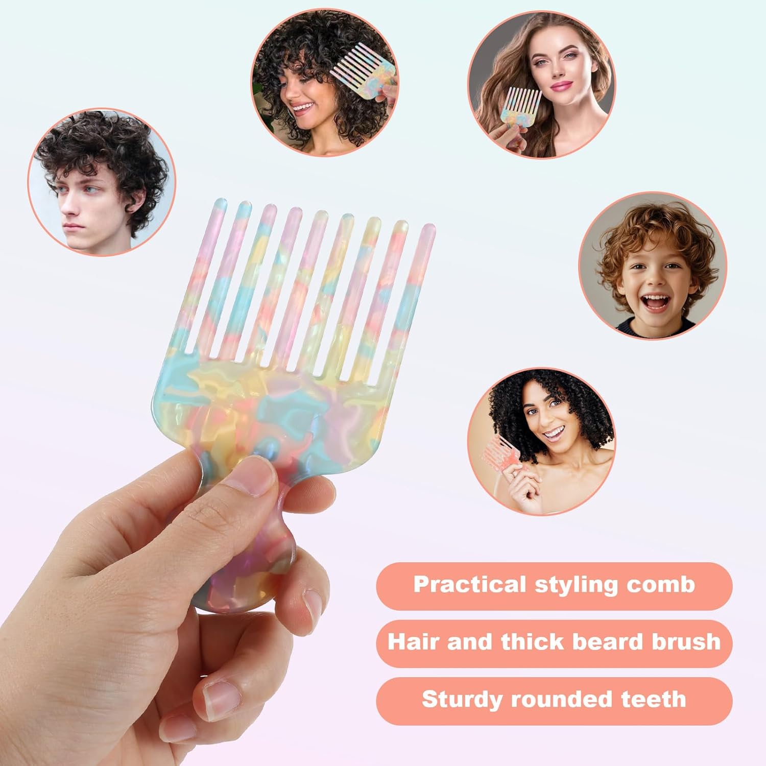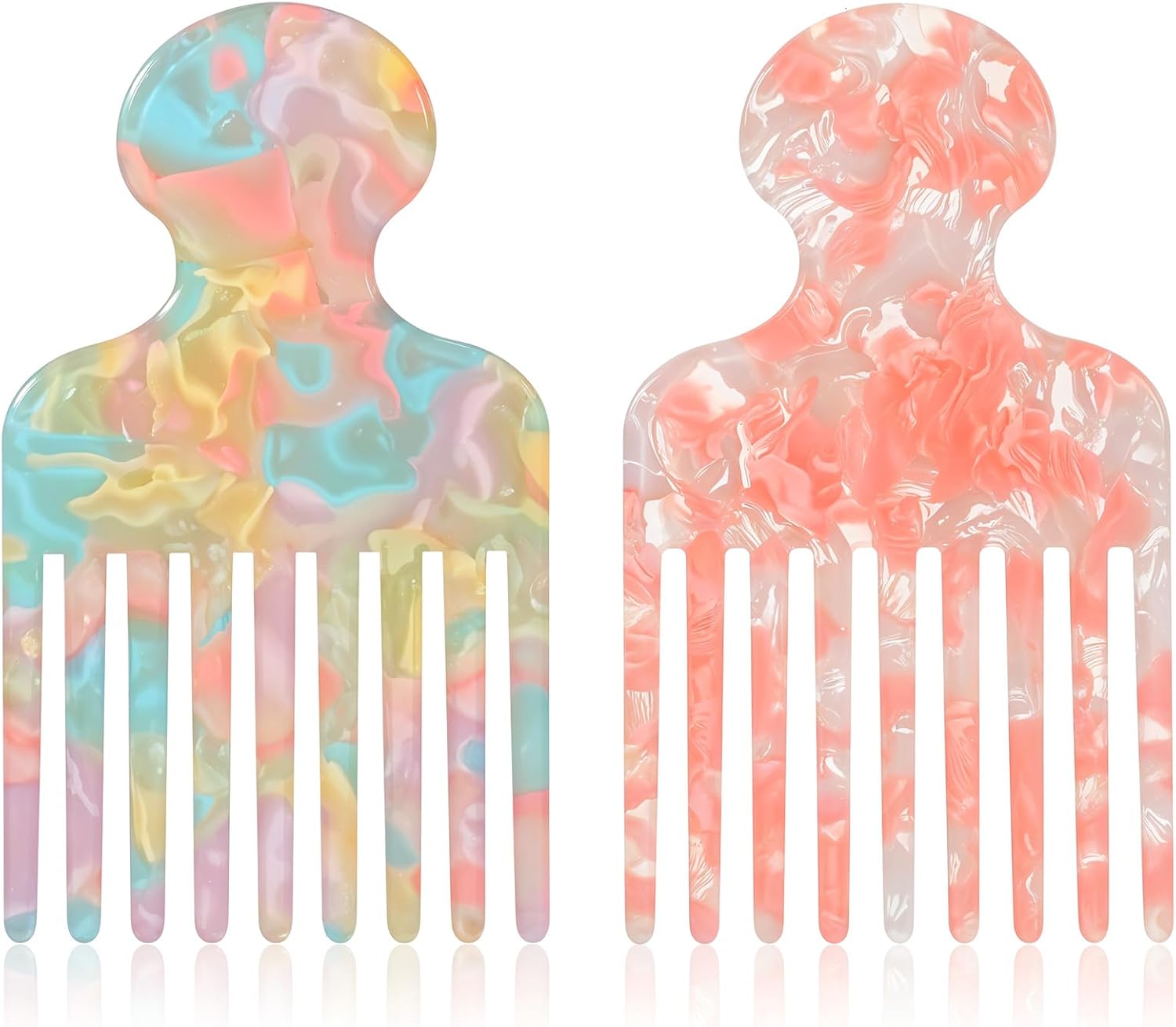Zestaw grzebieni z włókna octanowego: Grzebień o szerokich zębach dostępny jest w przyciągających wzrok odcieniach różu i wielokolorowych, idealnych do dodania odrobiny charakteru do codziennej pielęgnacji włosów. Unikalne marmurkowe wykończenie nie tylko prezentuje się elegancko, ale również pasuje do różnych strojów i fryzur.
