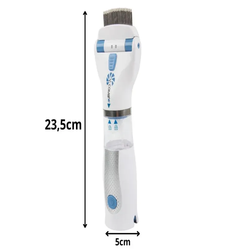 Grzebień wyposażony jest w metalowe, gęsto rozmieszczone ząbki, które dokładnie przeczesują włosy, a wbudowany system ssący zasysa pasożyty bez ryzyka ich rozprzestrzenienia. Podświetlenie LED ułatwia zauważenie nawet najmniejszych gnid. Urządzenie jest lekkie, ergonomiczne i wygodne w użyciu – idealne do domowej pielęgnacji włosów dzieci i dorosłych.