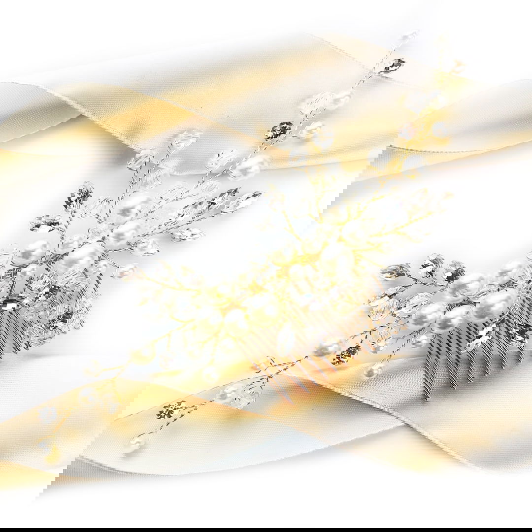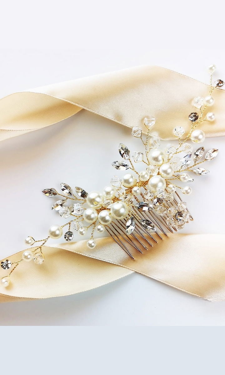 Wymiary: Długość grzebyka: 17,5cm, szerokość maksymalna części ozdobnej 6,50cmKolor: złoty, perłowy, kryształowyMateriał: metal wolny od niklu, kadmu i ołowiu, perły syntetyczne, cyrkonie