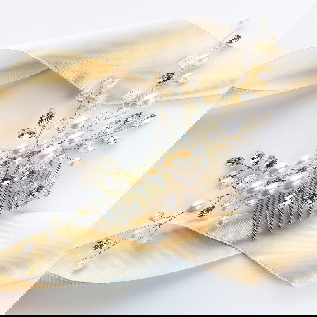 Połączenie pereł, cyrkonii i kryształków w delikatnym kolorze jasnego złota to z pewnością idealna propozycja do ślubnej fryzury w postaci niskiego koka, czy subtelnie podpiętych loków.