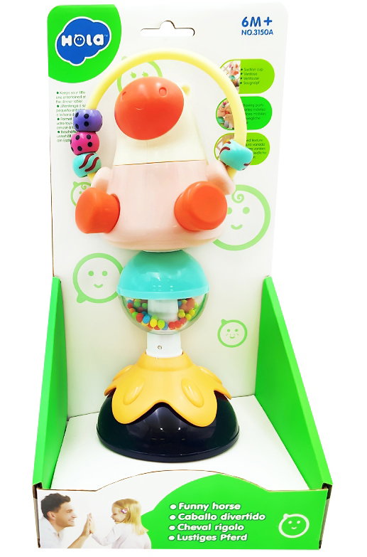 Wesoły konik to zabawka, która jest przeznaczona dla niemowląt w wieku sześciu miesięcy i starszych. Zabawka ma podstawę z przyssawką i jest zaprojektowana do przymocowania do tacy do jedzenia, aby zapobiec rzuceniu jej na podłogę podczas złości.
