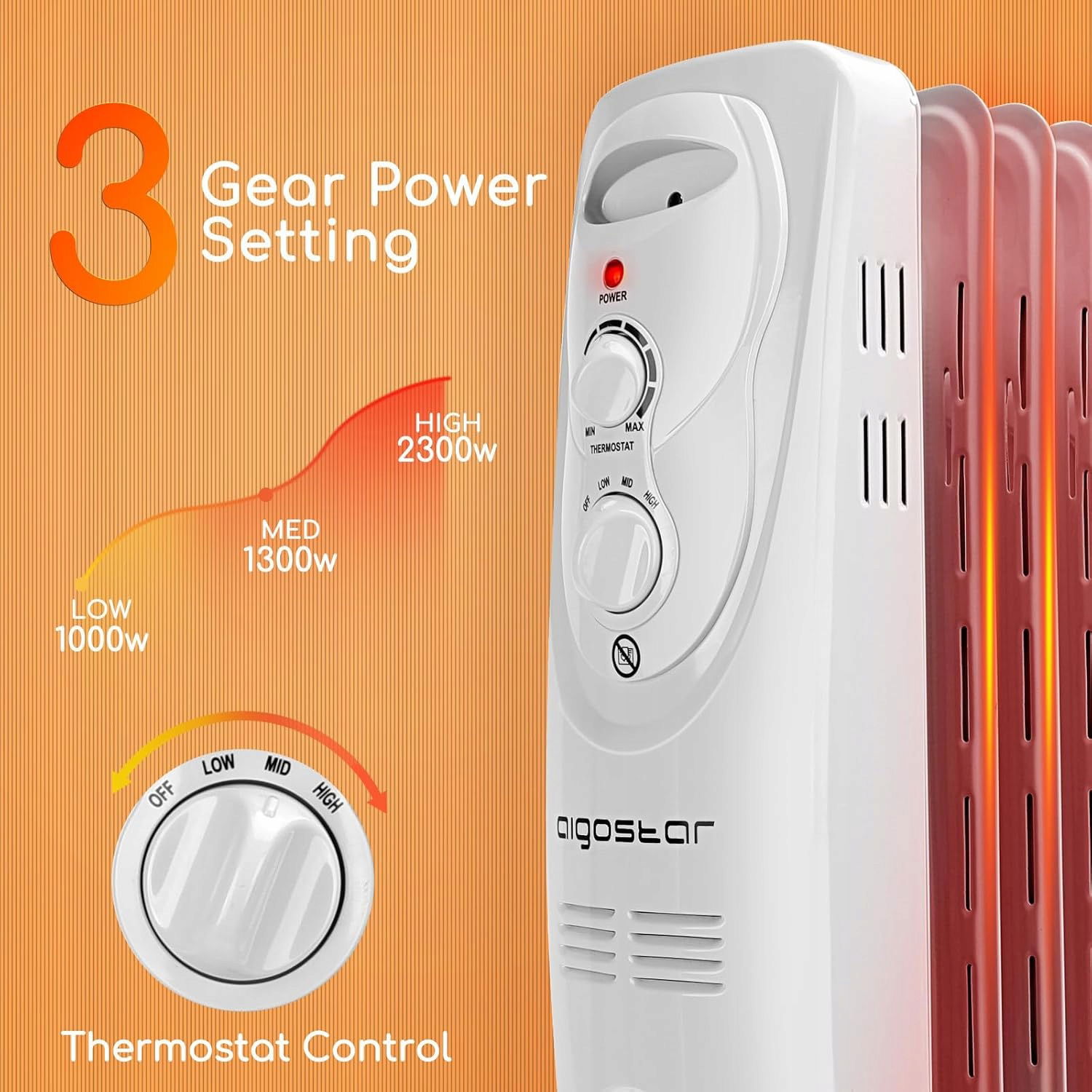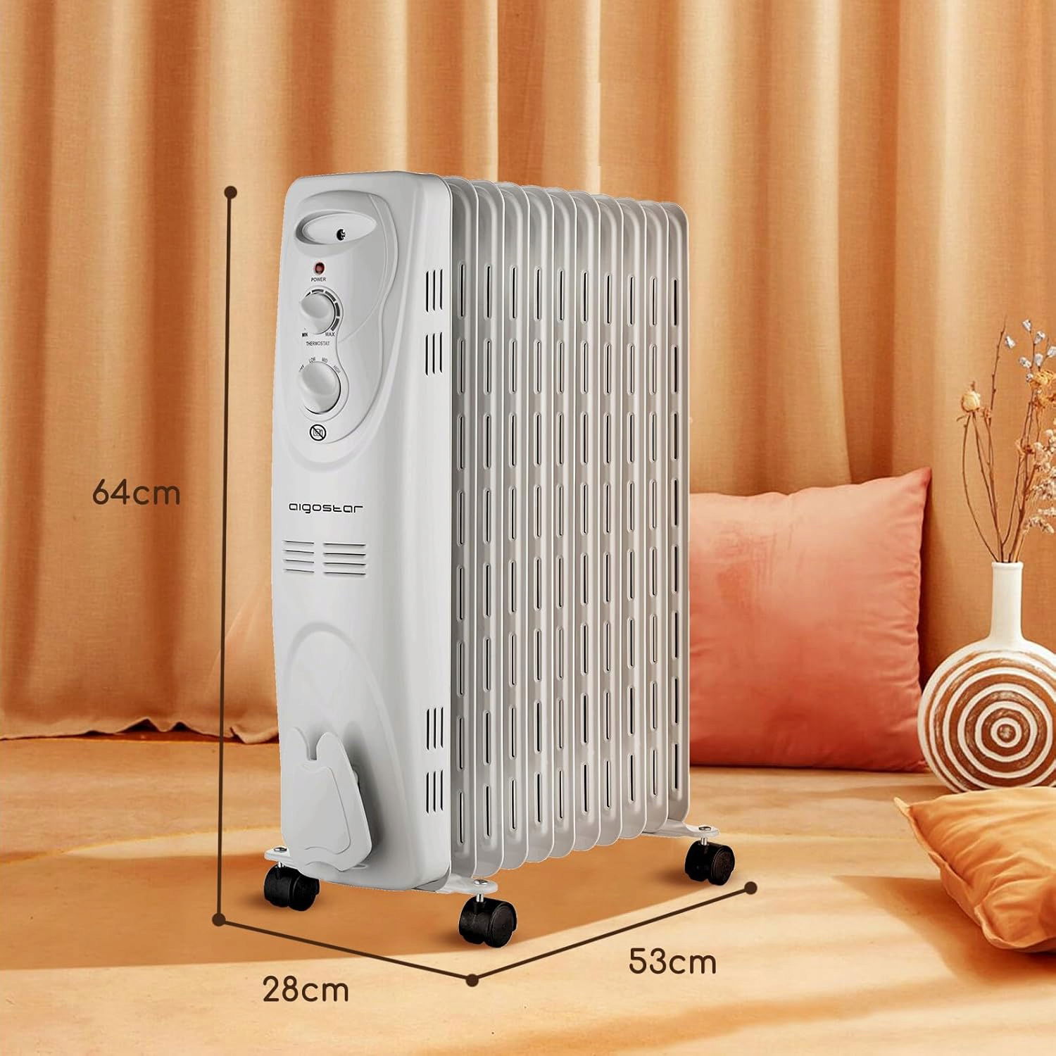 Łatwa obsługa to klucz do komfortu – dwa pokrętła pozwalają na szybkie ustawienie temperatury i trybu ogrzewania, a lampka LED informuje o pracy urządzenia. Aigostar to podejście do ogrzewania na miarę Twoich potrzeb.