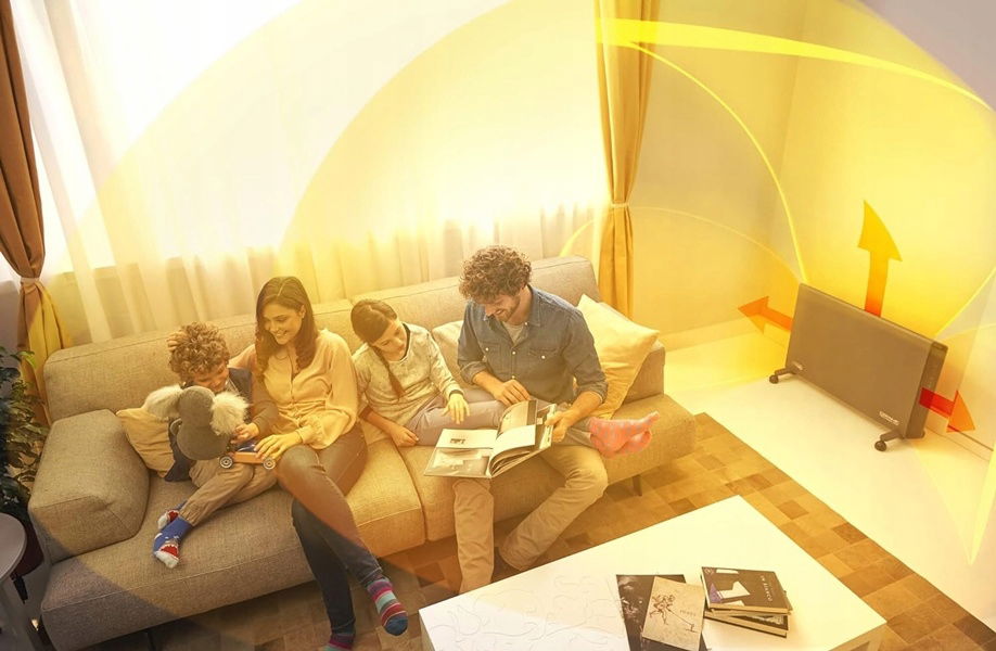 - urządzenie zasysa od dołu zimne powietrze, które rozgrzewa się po zetknięciu z grzałką elektryczną, a następnie dzięki konwekcji jest równomiernie rozprowadzane po pomieszczeniu, dzięki czemu powietrze pozostaje cały czas w procesie cyrkulacji.