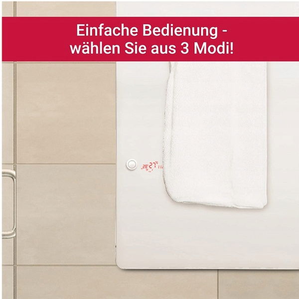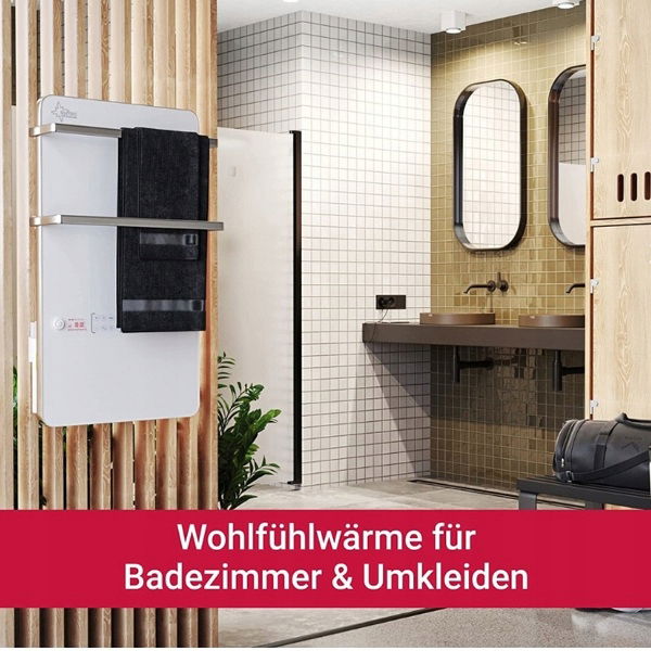 2 stopnie grzania (900/1800 watów) + 2 podgrzewane wieszaki na ręczniki (+200 W) + oddzielna funkcja wentylatora zapewniają wydajne, energooszczędne i ciche, aby zapewnić szybkie i przyjemne ciepło w łazience, przebieralni, pokoju hobby itp.